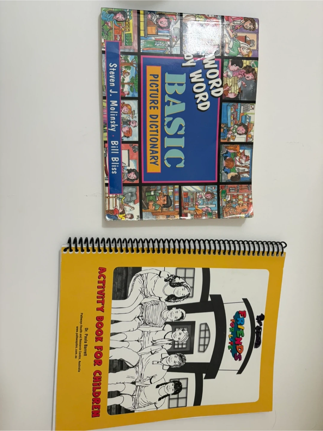 Giving a set of educational books for children. Includes a 'Word by Word Basic Picture Dictionary' by Steven J. Molinsky and Bill Bliss, and an activity book for children by Dr. Paula Barrett. Great for learning and fun!