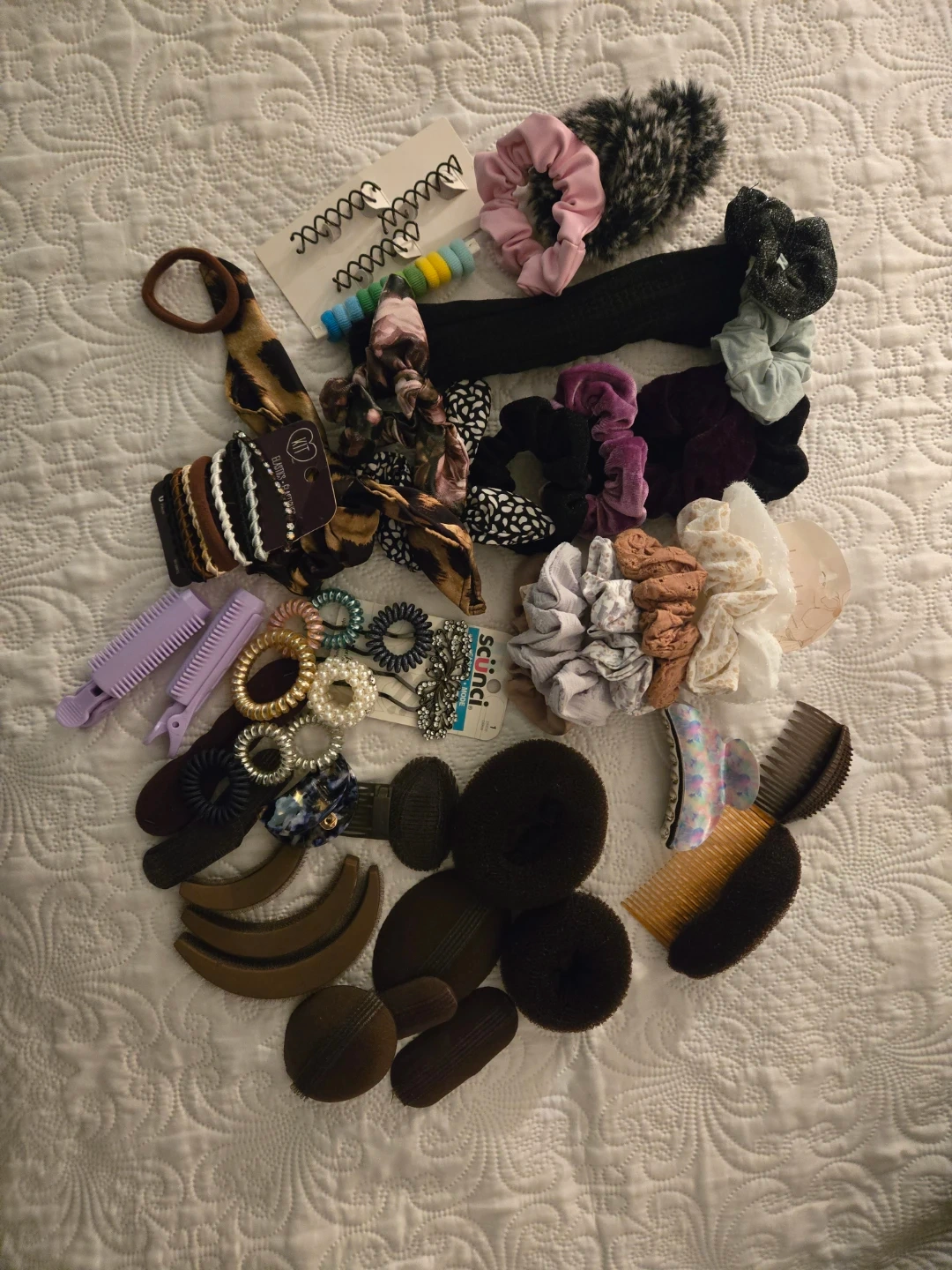 Selling a collection of various hair accessories! You'll find scrunchies, hair ties, clips, combs, and bun makers in this lot. Perfect for anyone looking to expand their hair styling options