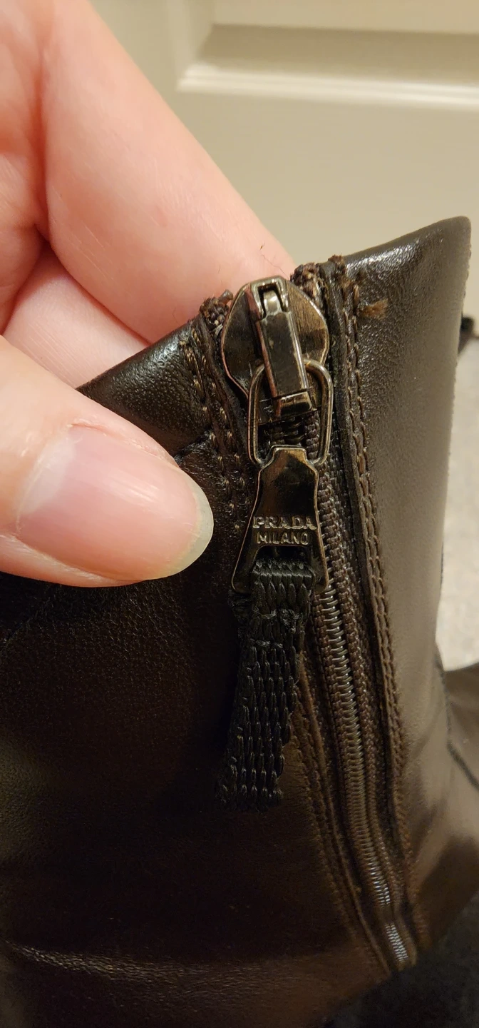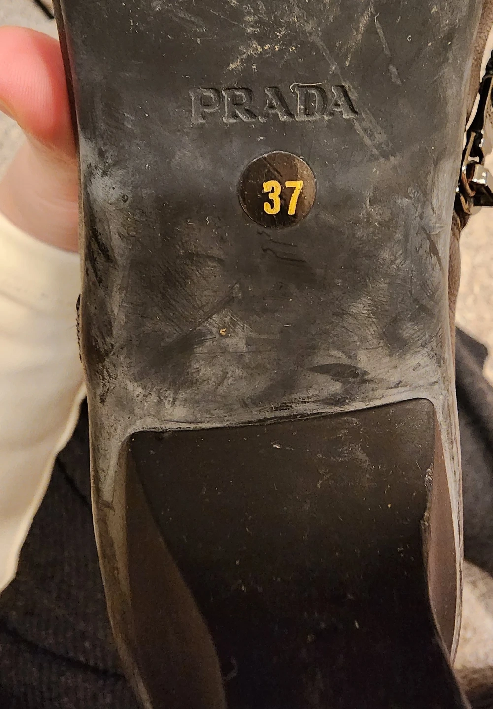 $200 firm, authentic Prada Milano kitten heels boots. Similar styles selling between $400-1500 CAD +taxes on various websites. Pickup near Rupert Station area, first come first serve. Condition: Good, gently used condition with no visible flaws and minor wear to sole and heels Item Details: • Brand: Prada Milano • Color: Brown • Country of Origin: Italy • Style: Ankle boots • Material: 100% geniune leather • Size: IT 37 (US 7 Women's) • Heels Height: 3cm (1-inch) • Sole: Rubber • Toe Style: Square • Closure: Zipper • Comes With Original Box?: No • Styles: Minimalist, Old Money **PICKUP ONLY @ Rupert Station area** *first come first serve *SOLD AS IS