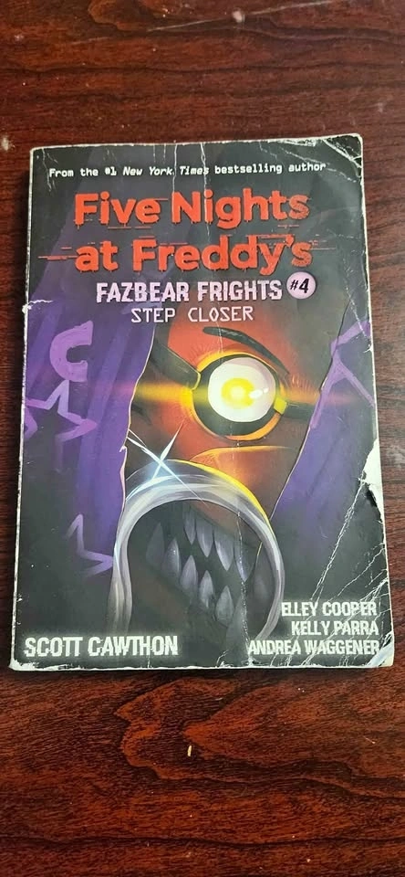 Worn paperback copy of Five Nights at Freddy's Fazbear Frights #4 Step Closer by Scott Cawthon. The cover has tears and creases. Book itself is in good condition otherwise.