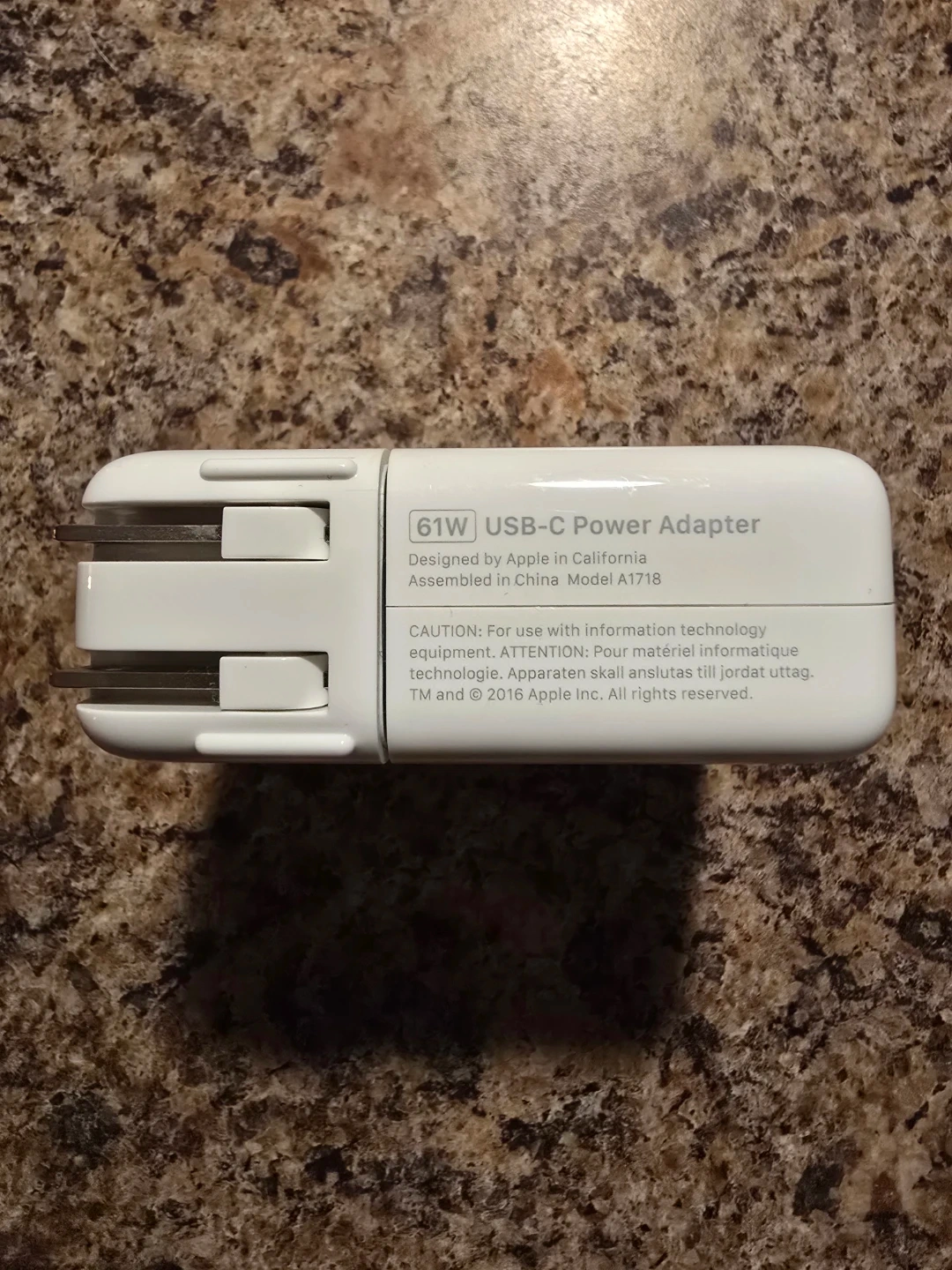 Selling an Apple 61W USB-C Power Adapter in excellent condition! It's designed by Apple in California and assembled in China, Model A1718. Perfect for charging your USB-C compatible devices!