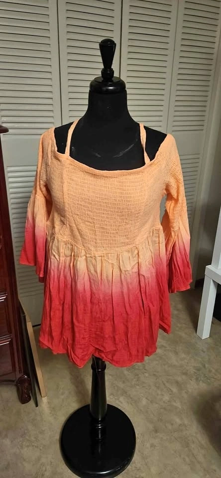 New Torrid top with adjustable straps and a flowy design. Gradient goes from peach at the top to red at the bottom. Has a smocked bodice and ruffled hem. Still has the tag attached. Retailed for 74.50
