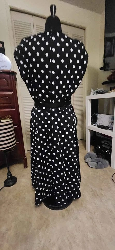 Black dress with white polka dots. V-neckline, short sleeves, and belted waist. Knee-length. Blame betty Pinup Couture brand, size 2X. Fits more like an xl. Like new condition. Worn once in 2012 for my convocation. Has sat in my closet since. Pick up huntington hills nw