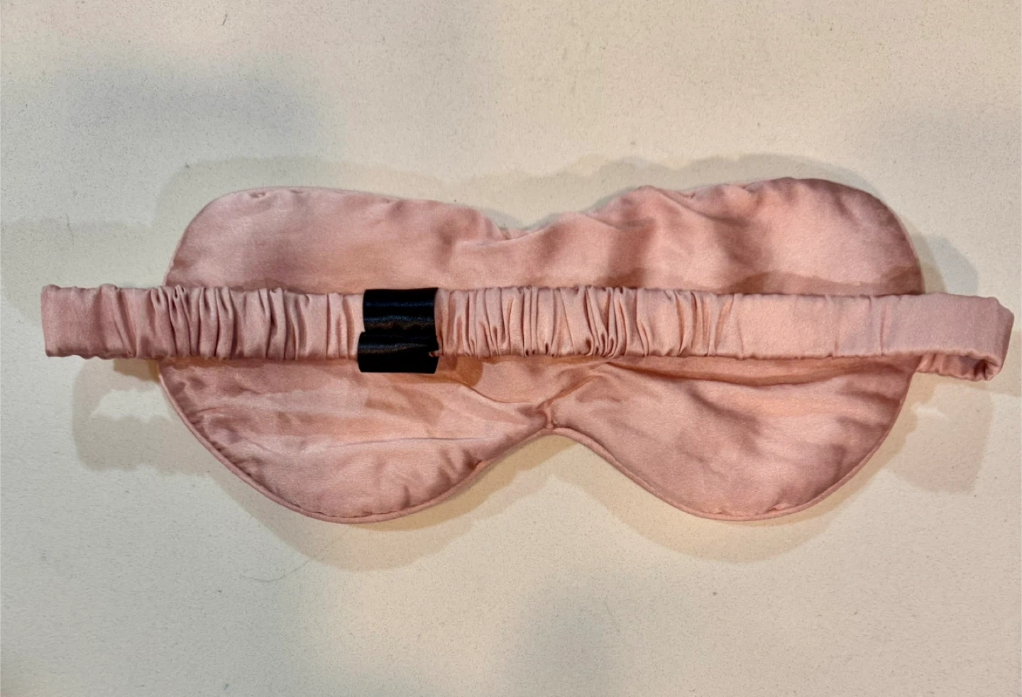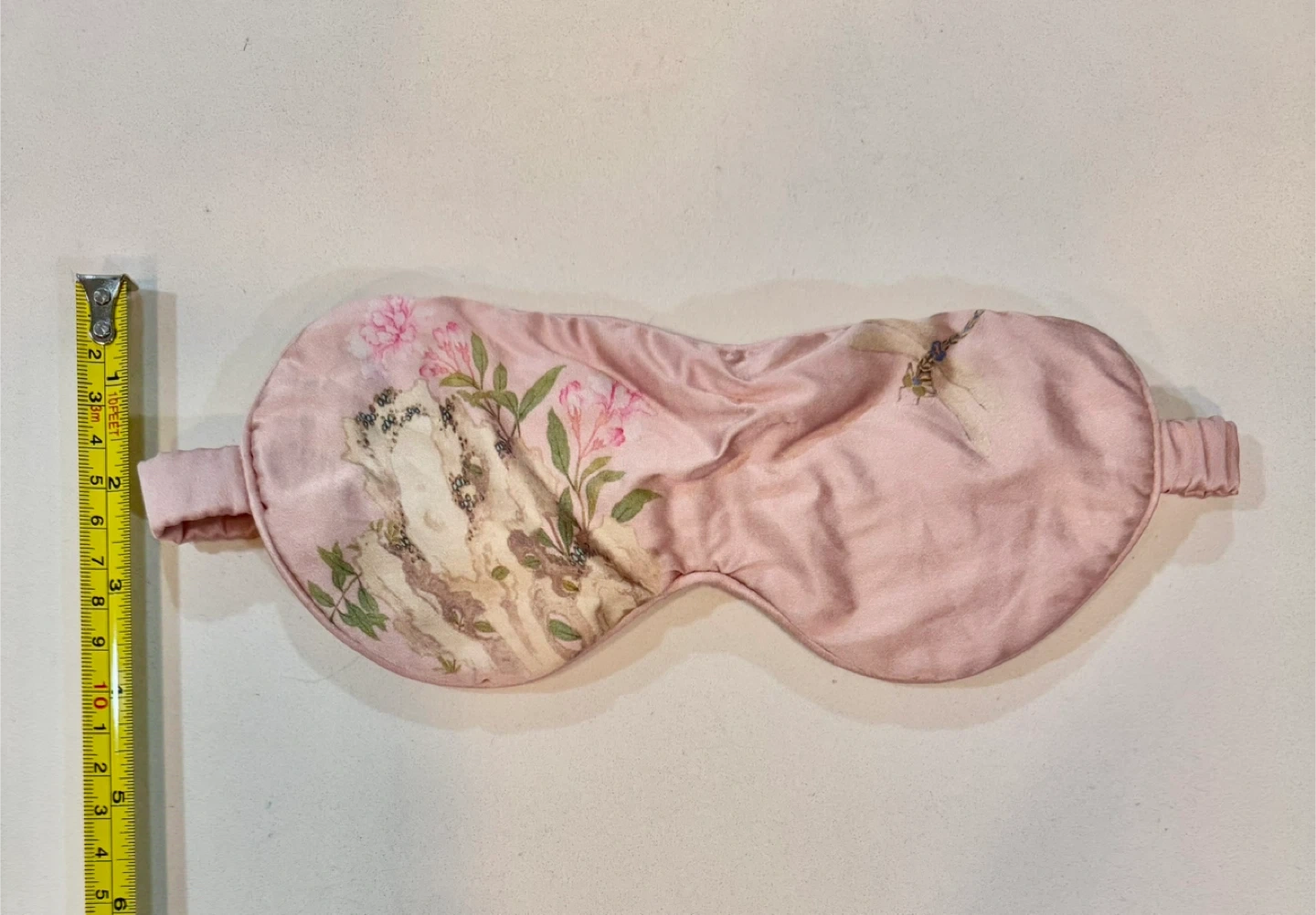 Here's a lovely pink silk sleep mask with a floral design! It's in great condition and measures about 8 inches in length. Perfect for a restful night's sleep or a relaxing nap.