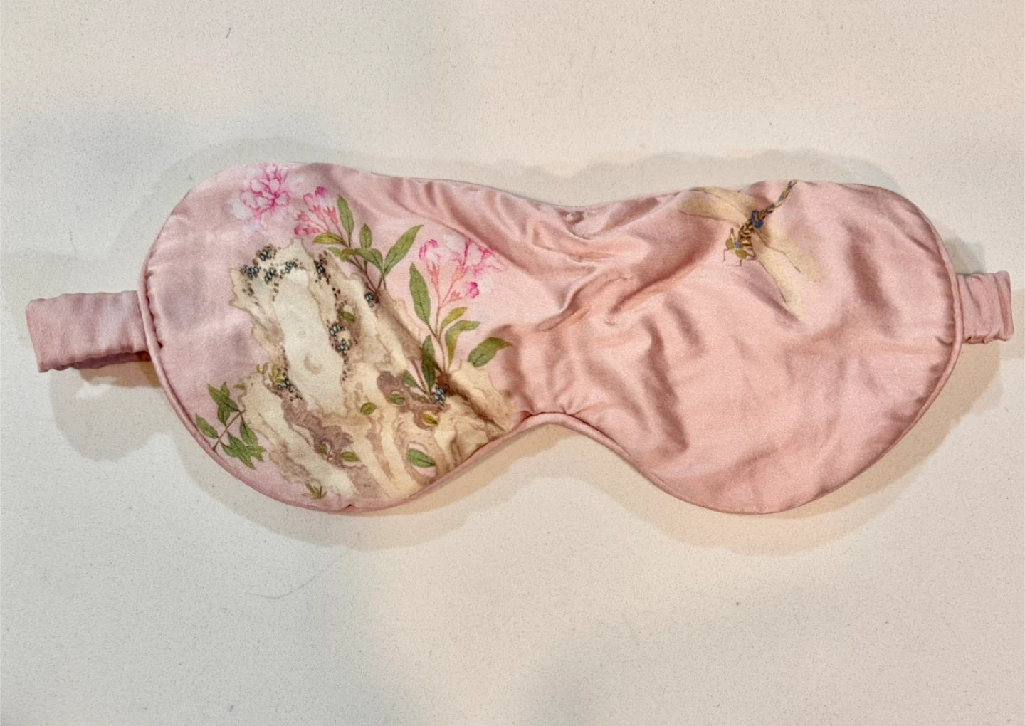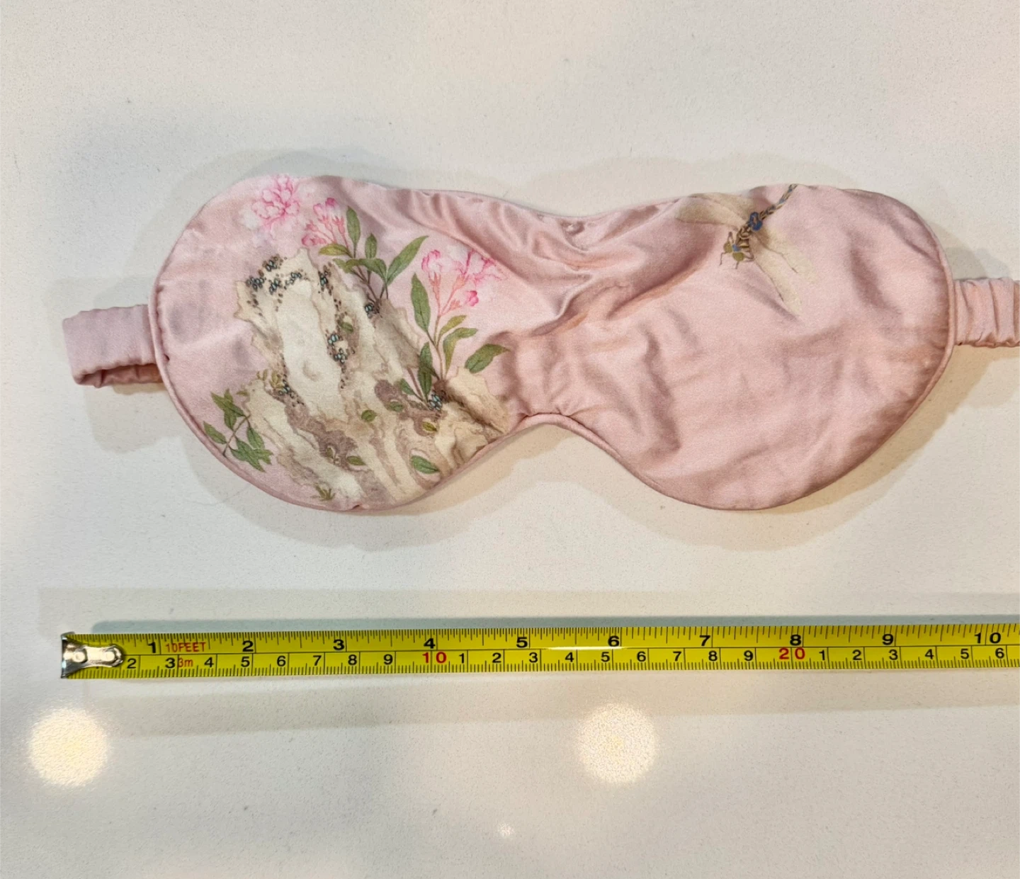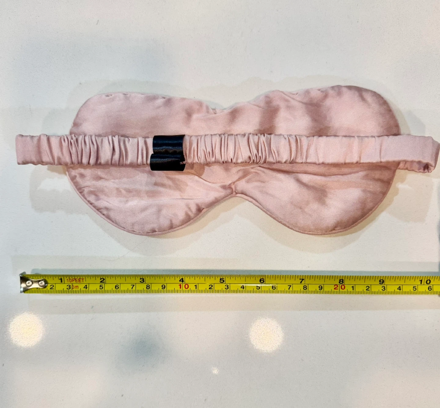 Here's a lovely pink silk sleep mask with a floral design! It's in great condition and measures about 8 inches in length. Perfect for a restful night's sleep or a relaxing nap.