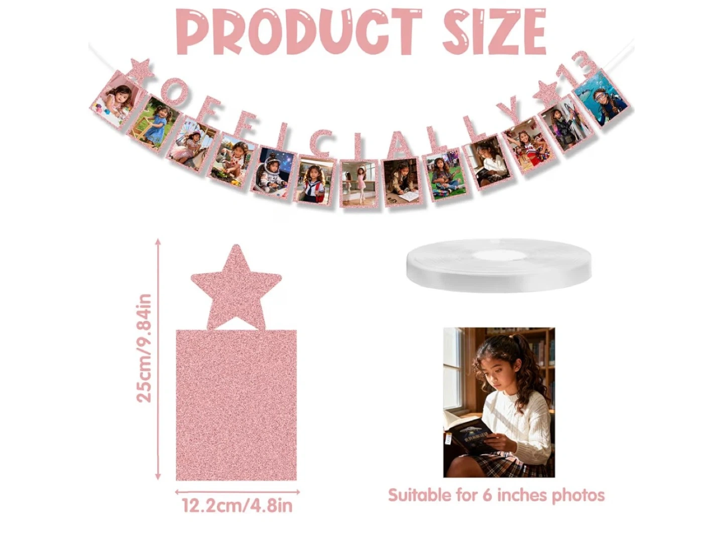 This is a cute 'Officially 13' photo banner, perfect for a 13th birthday celebration! It's designed to hold 6-inch photos and includes a ribbon for hanging. The banner pieces are approximately 25cm tall and 12.2cm wide.