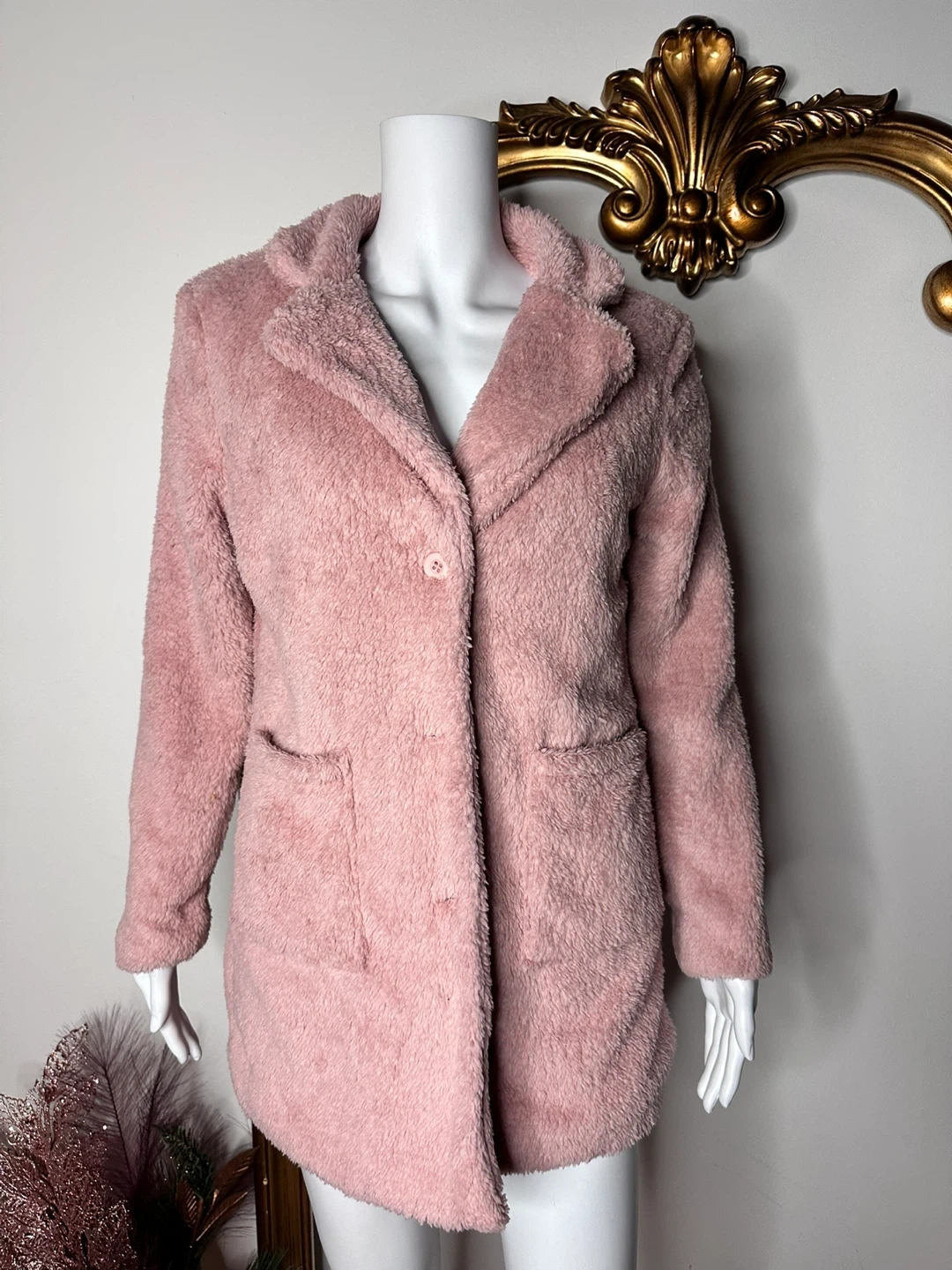 Selling a cozy pink teddy bear coat! This coat is super soft and perfect for staying warm during the colder months. It features a button closure and two front pockets.
