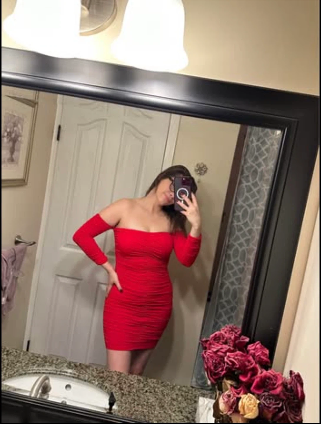 A cute red mini dress with a ruched design! It's a bodycon style with long sleeves and off-the-shoulder design. Perfect for a night out or a special occasion