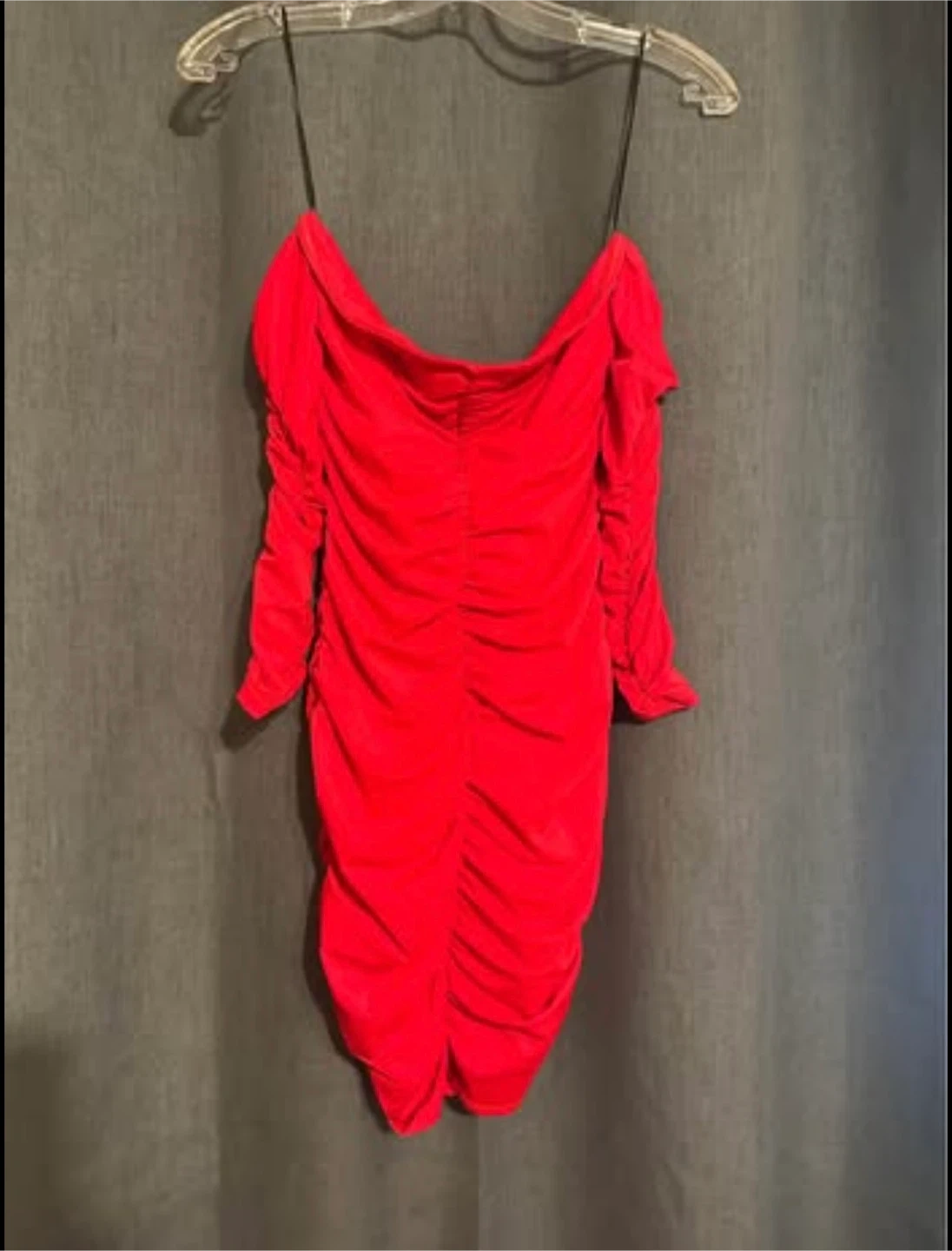A cute red mini dress with a ruched design! It's a bodycon style with long sleeves and off-the-shoulder design. Perfect for a night out or a special occasion