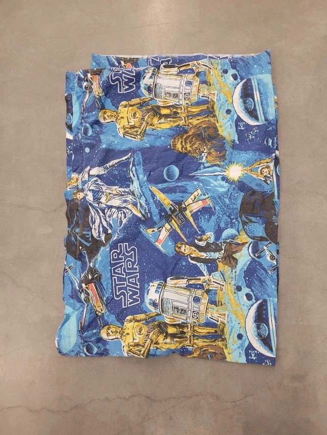 This is a used Star Wars themed sheet, featuring iconic characters and spacecraft from the beloved franchise. The sheet shows signs of wear, with some fading and minor imperfections that add to its vintage charm. * Vibrant Star Wars graphics * Twin size * Polyester/cotton blend Looking to add a touch of intergalactic flair to your bedroom? This Star Wars sheet could be yours! And remember, if the ad is still up, the sheet is still available for purchase, may the Force be with you!