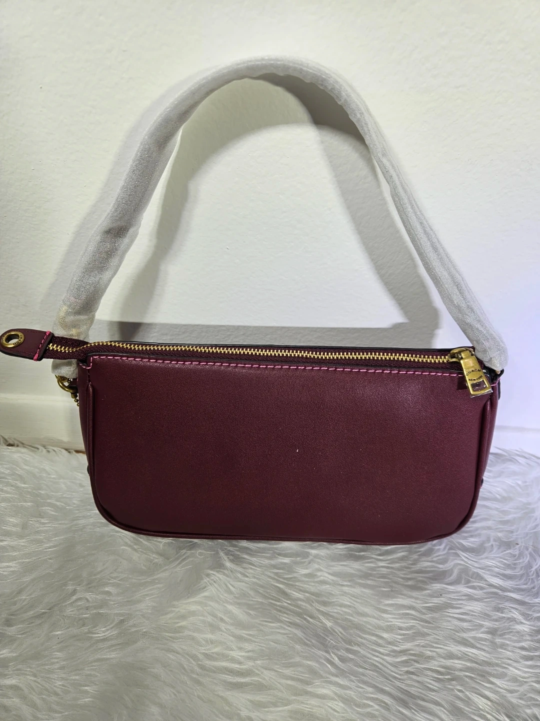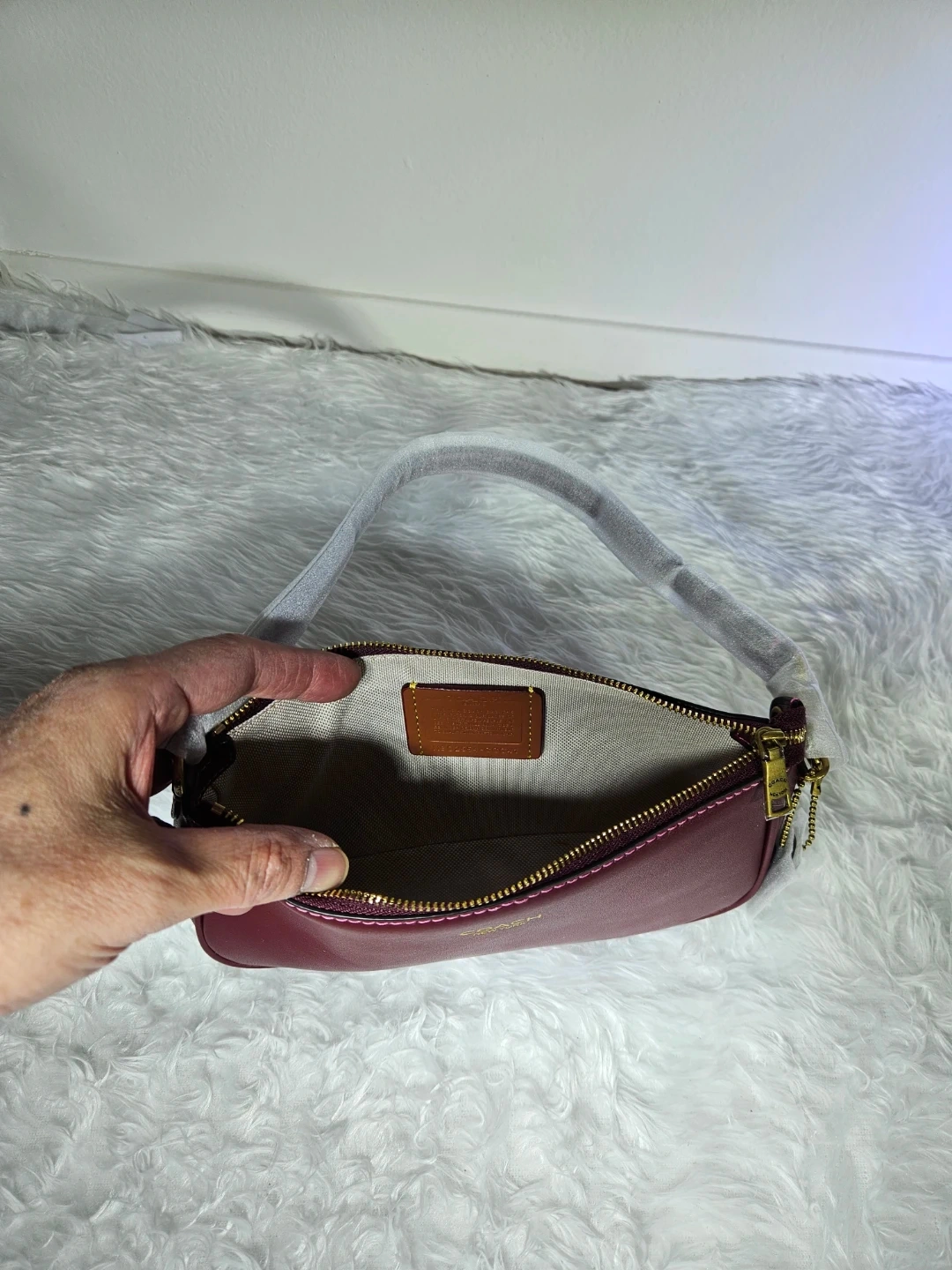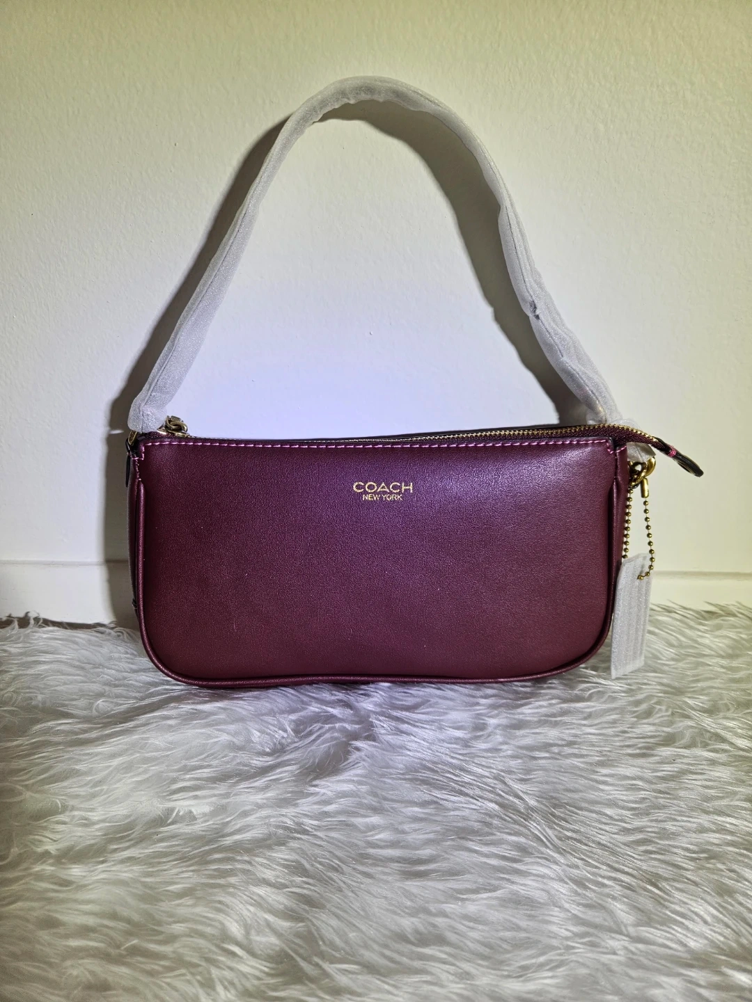 Here's a brand new Coach mini baguette bag! It's a beautiful purple colour and made of leather. It's a stylish and compact bag, perfect for carrying essentials.