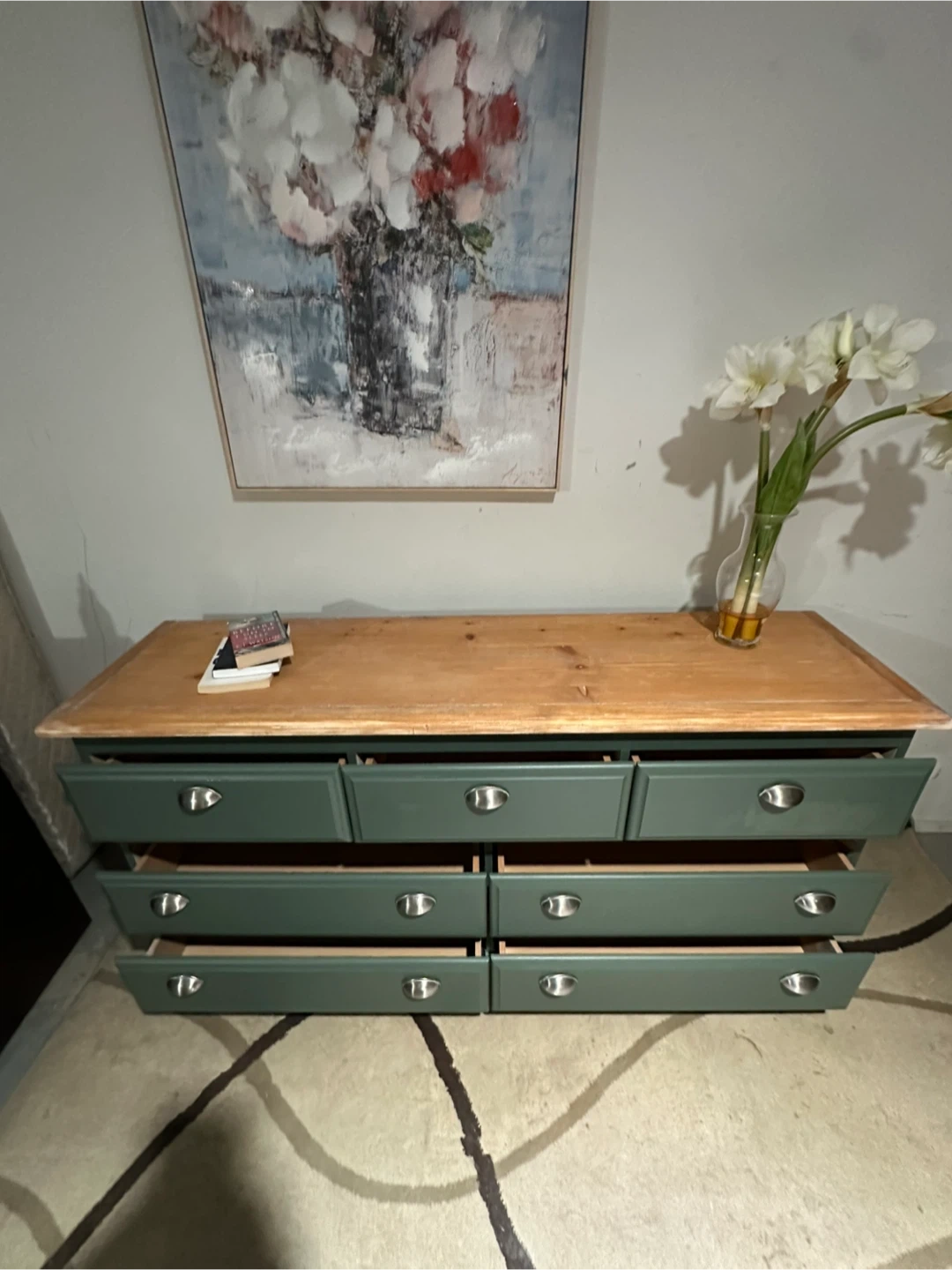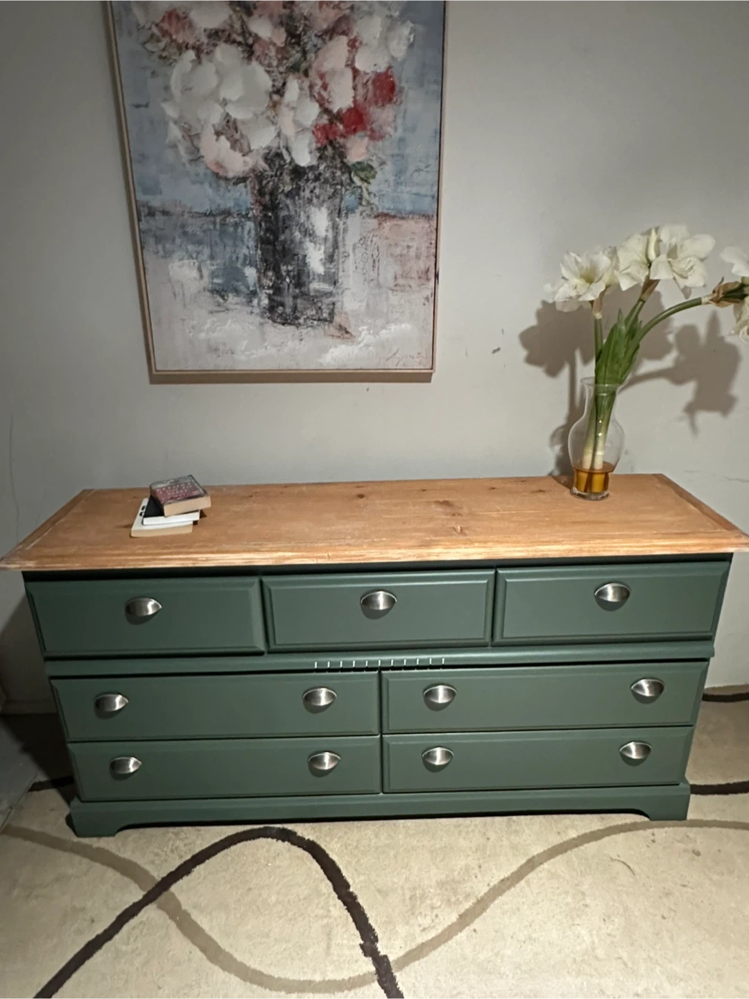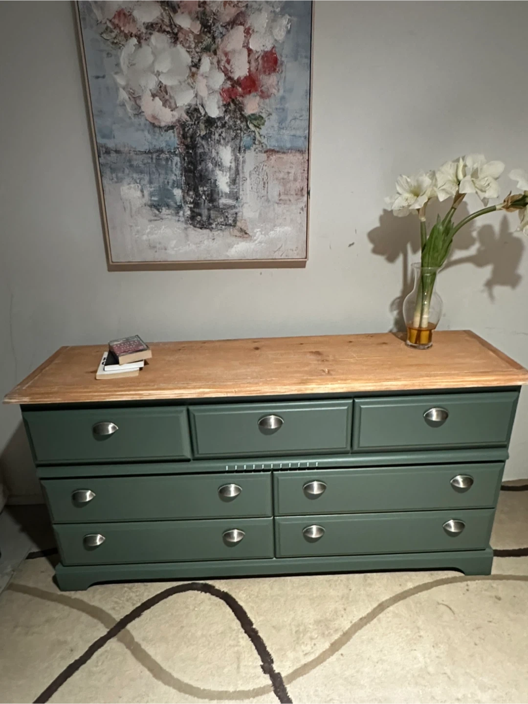 Selling a lovely green dresser with a wood top! It features seven drawers and would be a great addition to any room. The dresser has a unique design with silver knobs.
