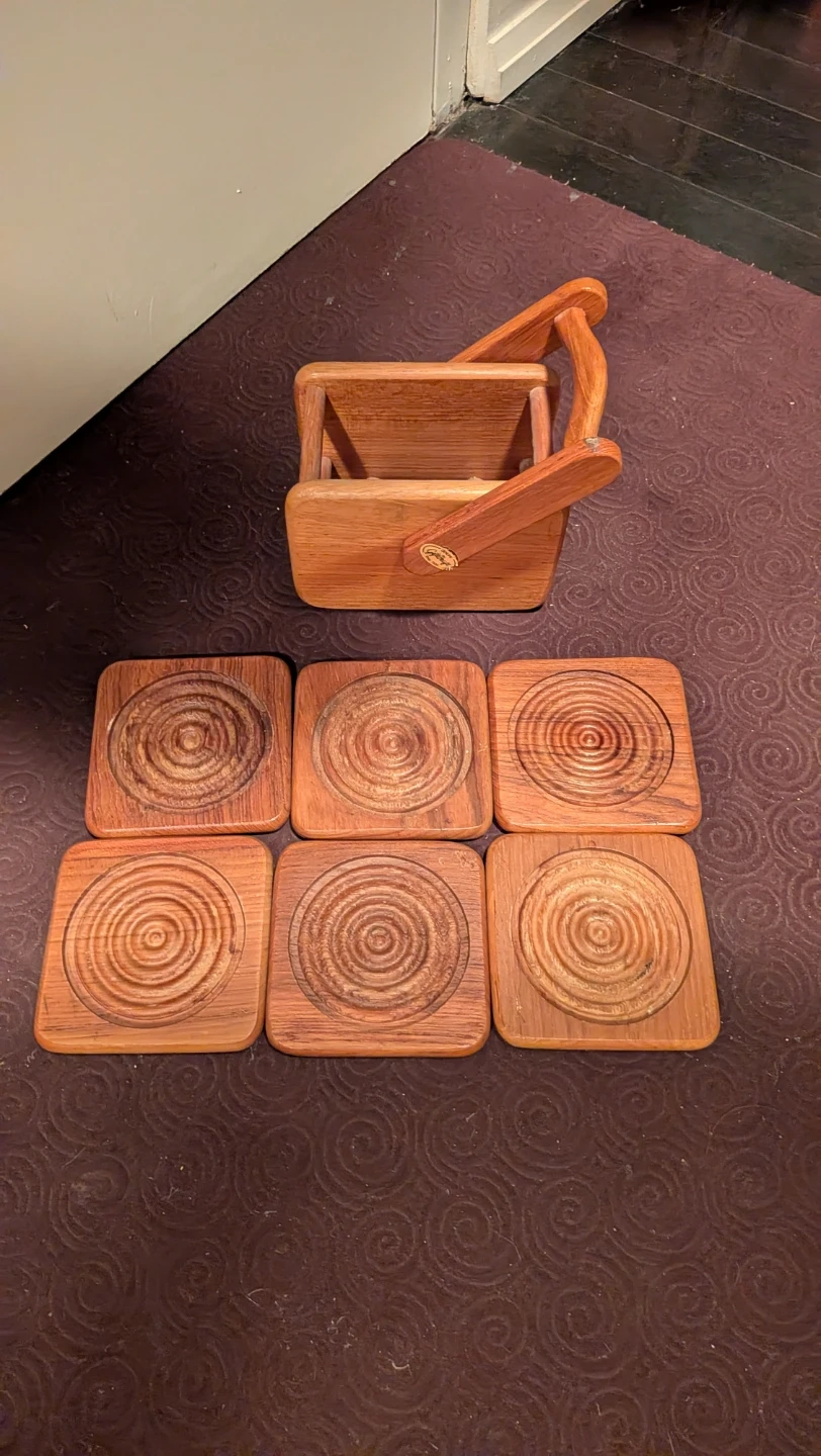 Selling a set of vintage wooden coasters with a cute little holder. They're in great shape and ready to protect your tables from condensation!