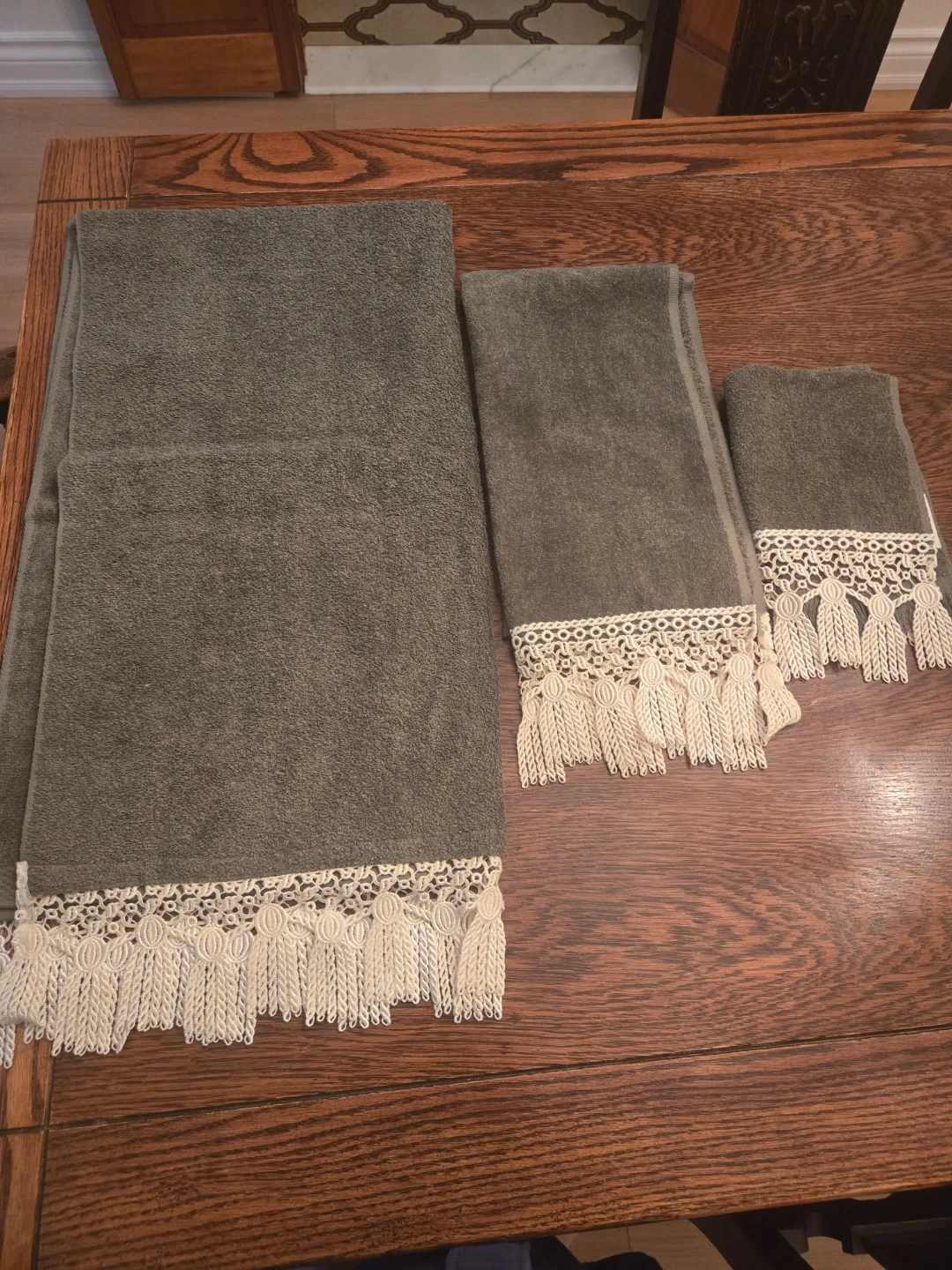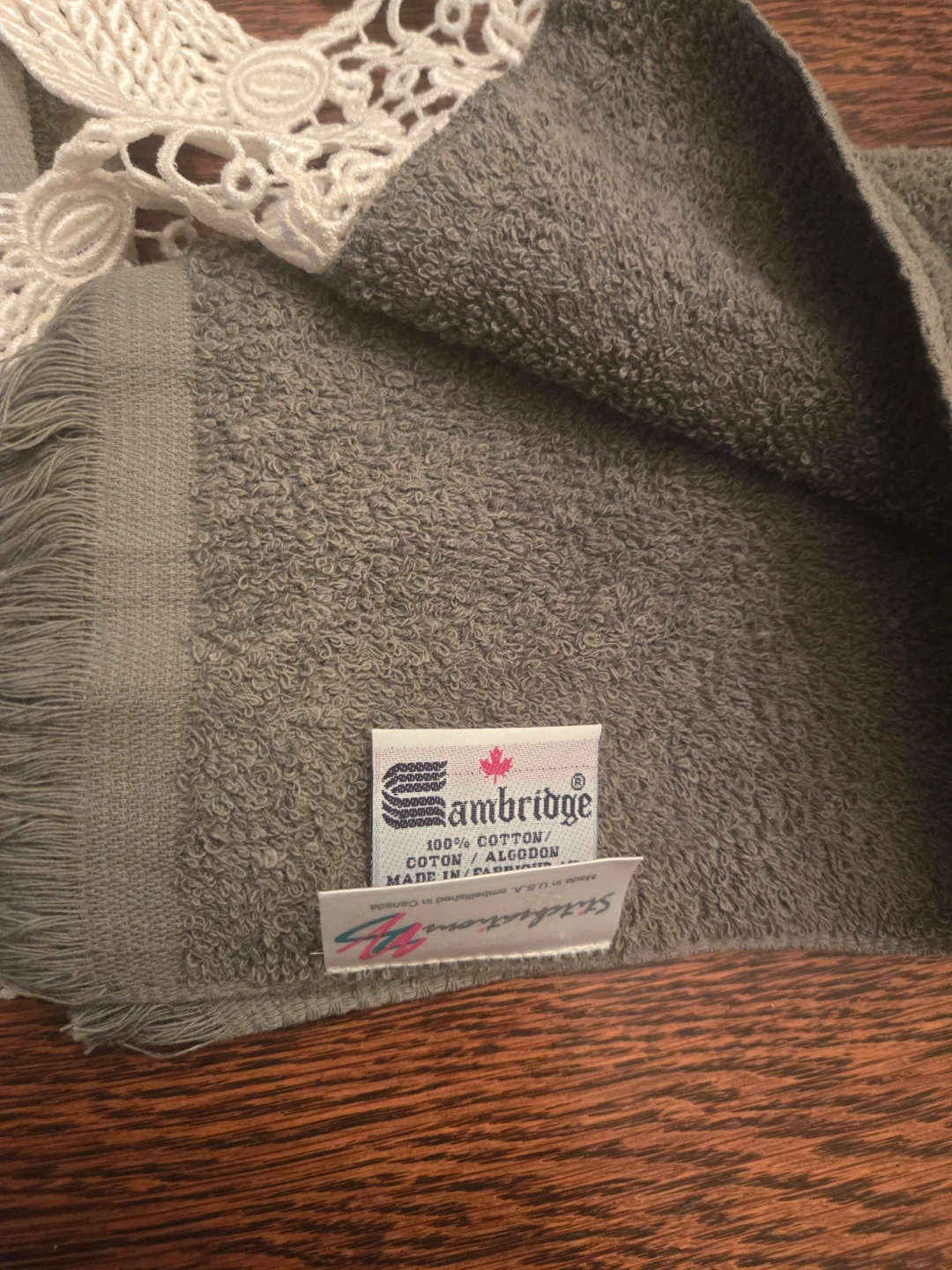 Here's a lovely Cambridge towel set to spruce up your bathroom! This set includes three pieces, each adorned with a delicate lace trim. They are made of 100% cotton, so they are soft and absorbent.