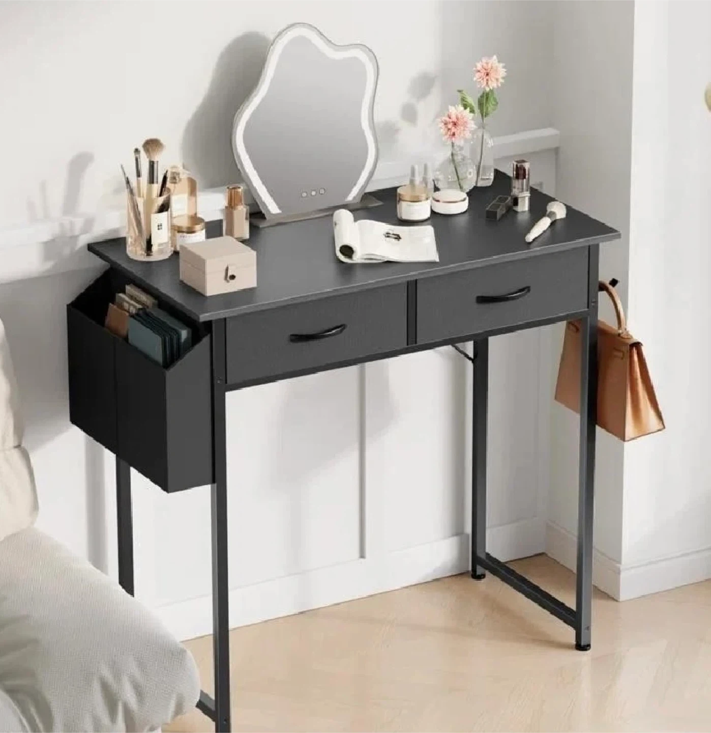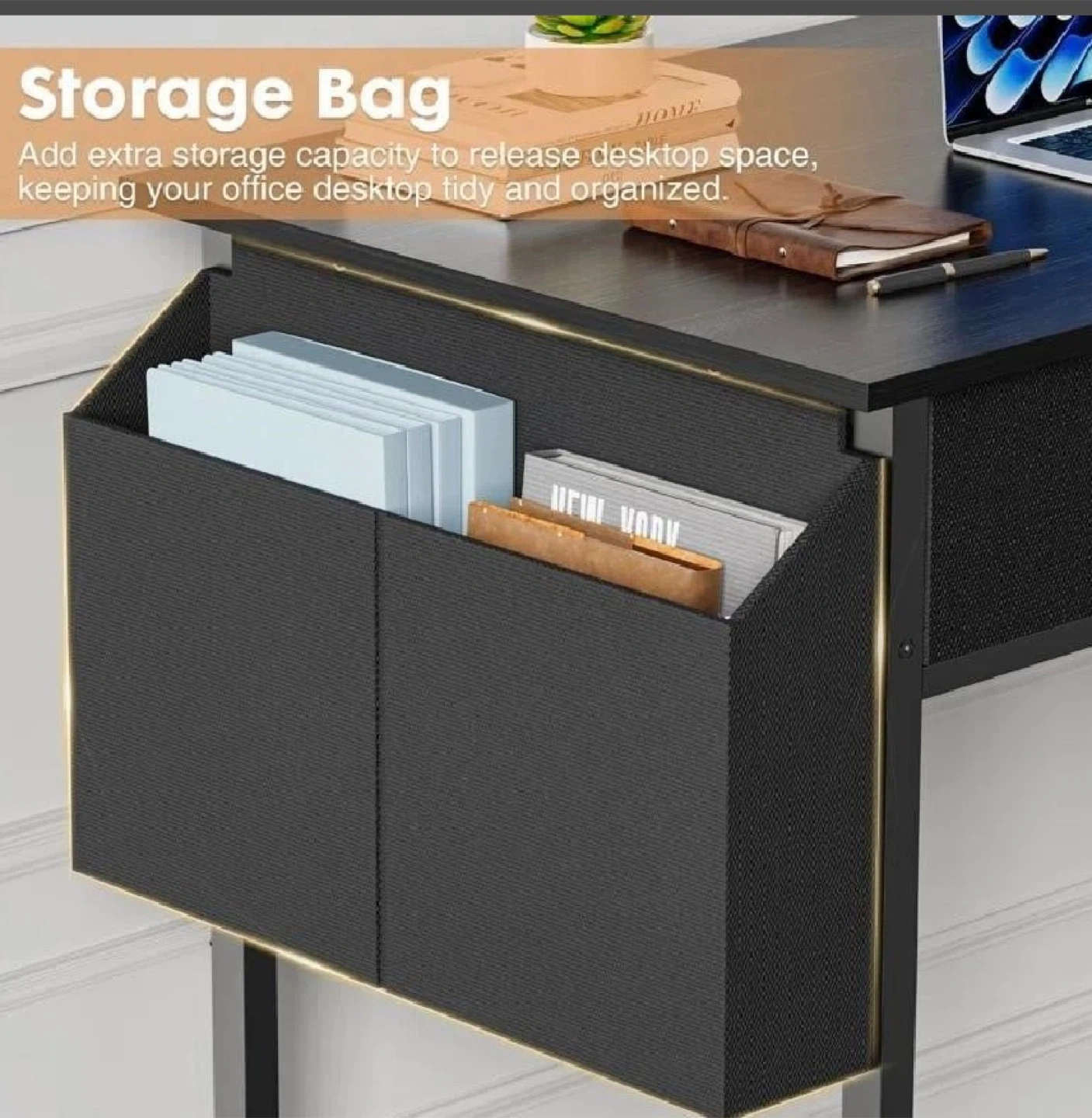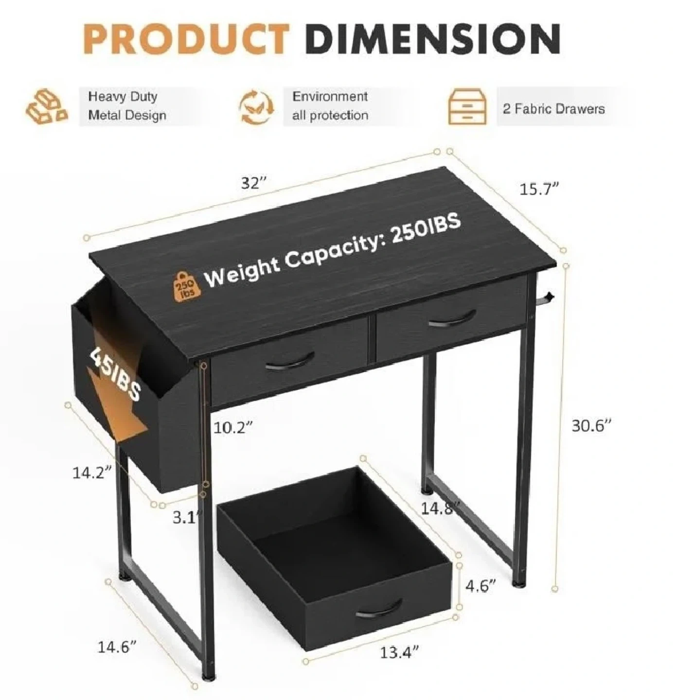 This new 32-inch home/office computer desk offers a compact and efficient workspace solution. Featuring a heavy-duty metal design and two fabric drawers plus a side storage bag, it combines durability with ample storage, perfect for any home or office setting.