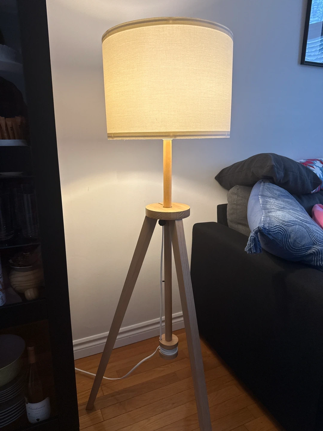 Selling a stylish tripod floor lamp! It features a natural wood finish and a neutral beige shade, perfect for adding a warm glow to any room. It's in great condition and ready to brighten up your space