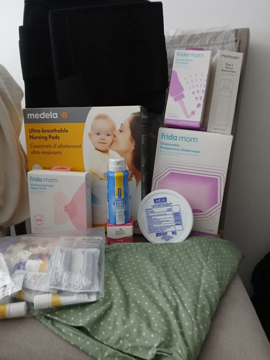 It also includes a belly support band and feeding baby cover (green one) for public places. All items are new except the nursing pads