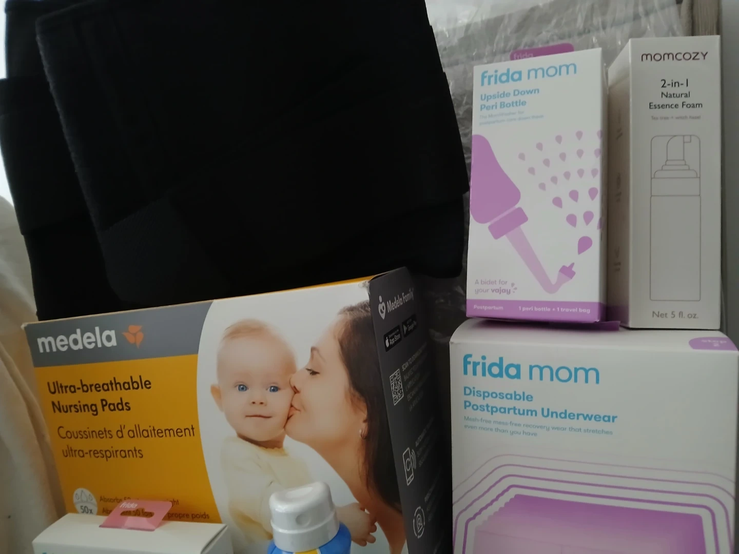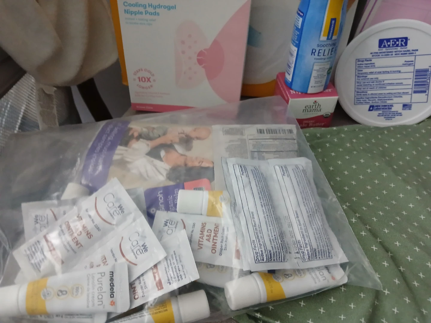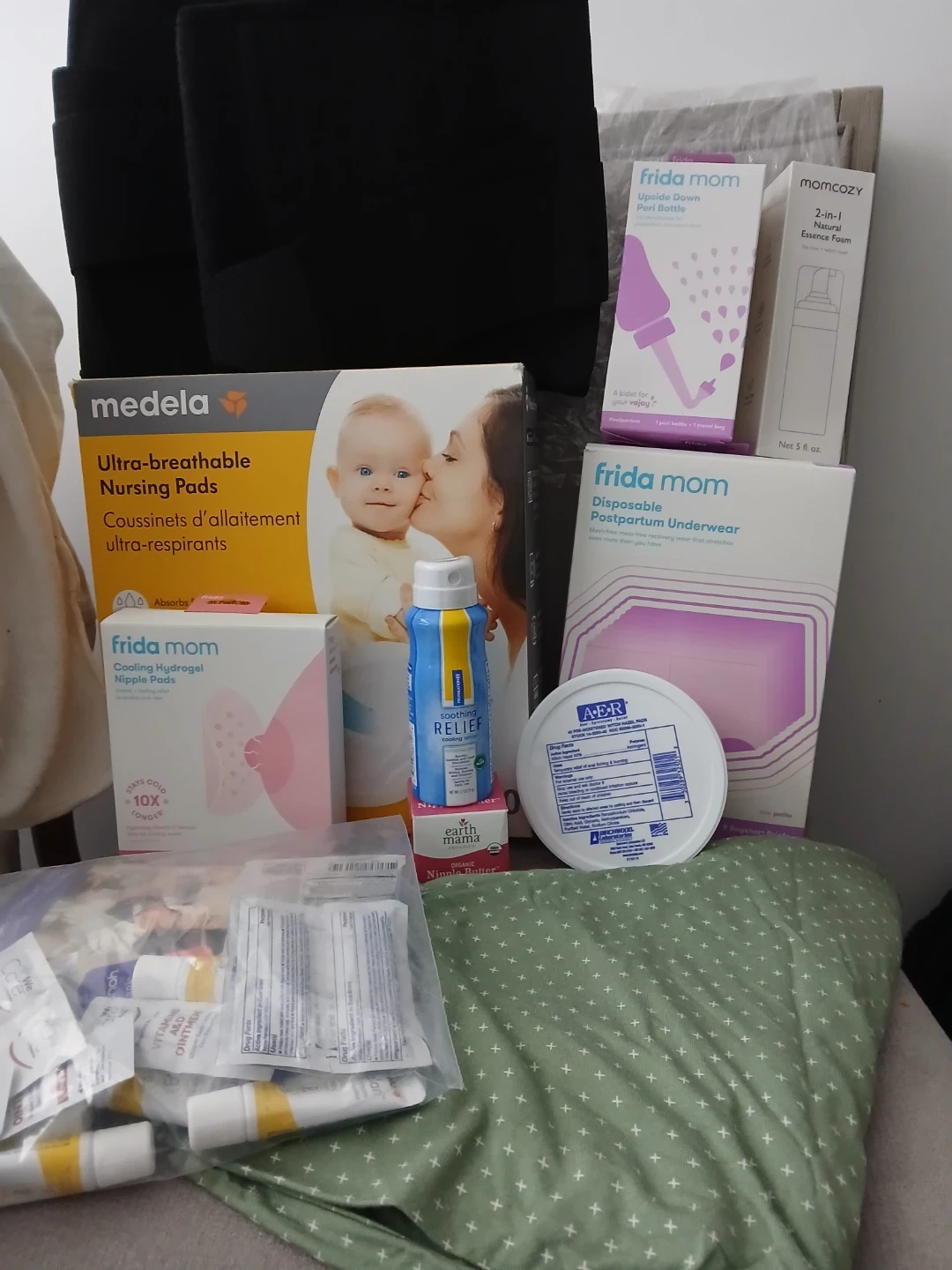 It also includes a belly support band and feeding baby cover (green one) for public places. All items are new except the nursing pads