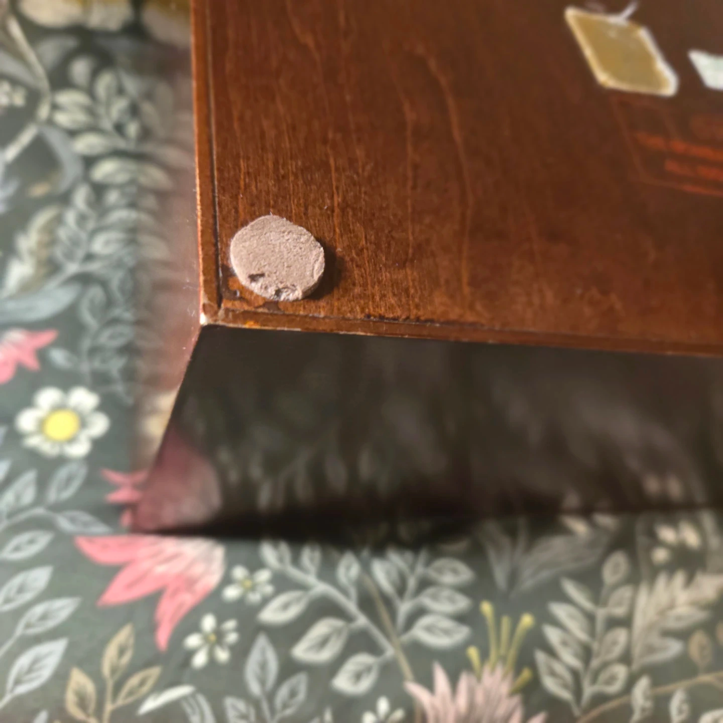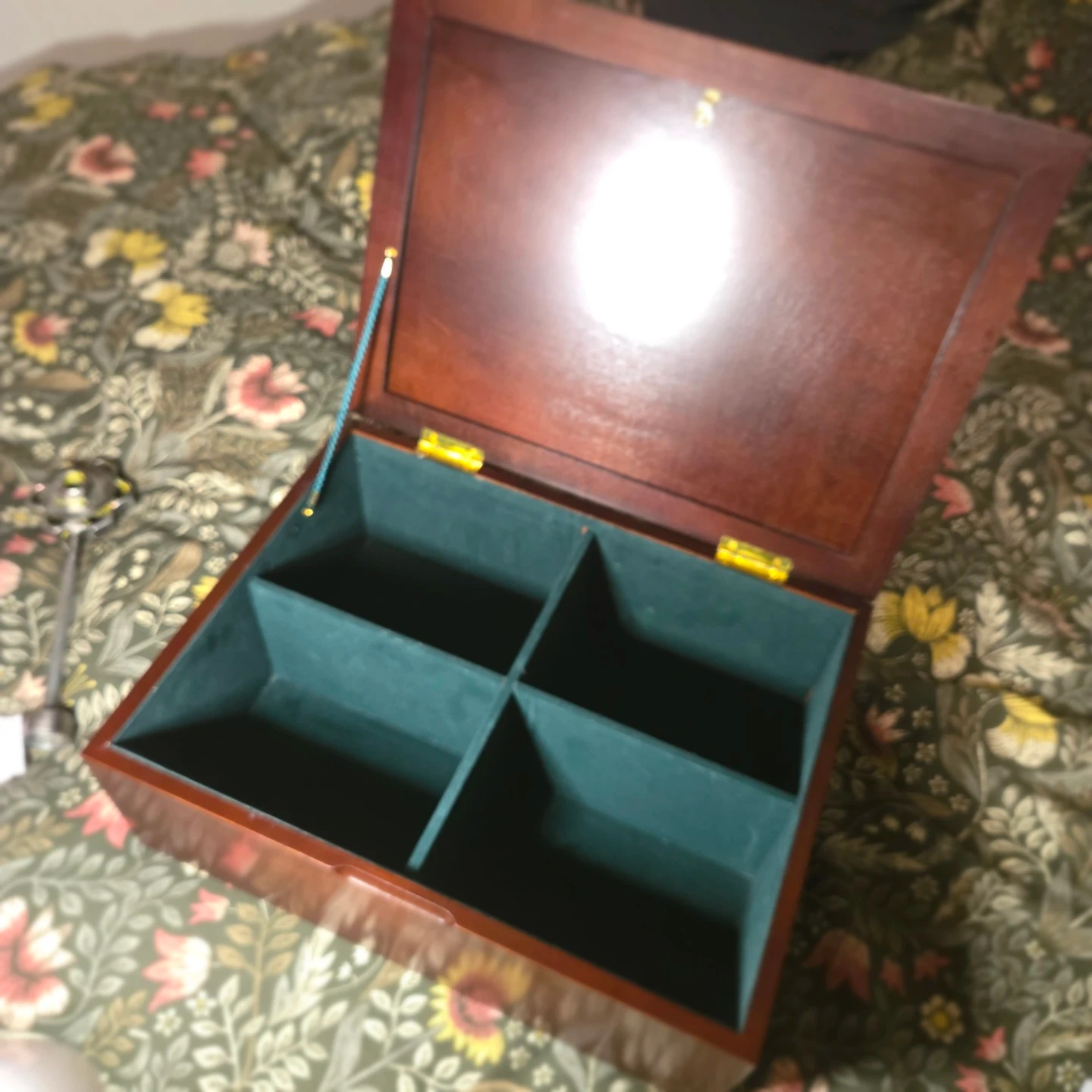 It is cherry wood in great condition, with only imperfection visible on the bottom of the box. Perfect for keepsakes, photos, jewelry, etc.
