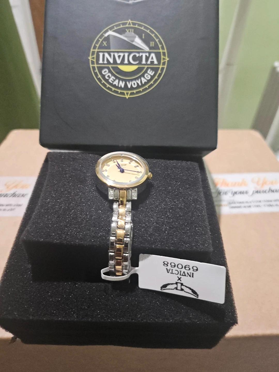 Selling an Invicta Ocean Voyage watch, model 69068. It comes with its original box. The watch features a two-tone silver and gold band with a gold face. A stylish addition to any collection!