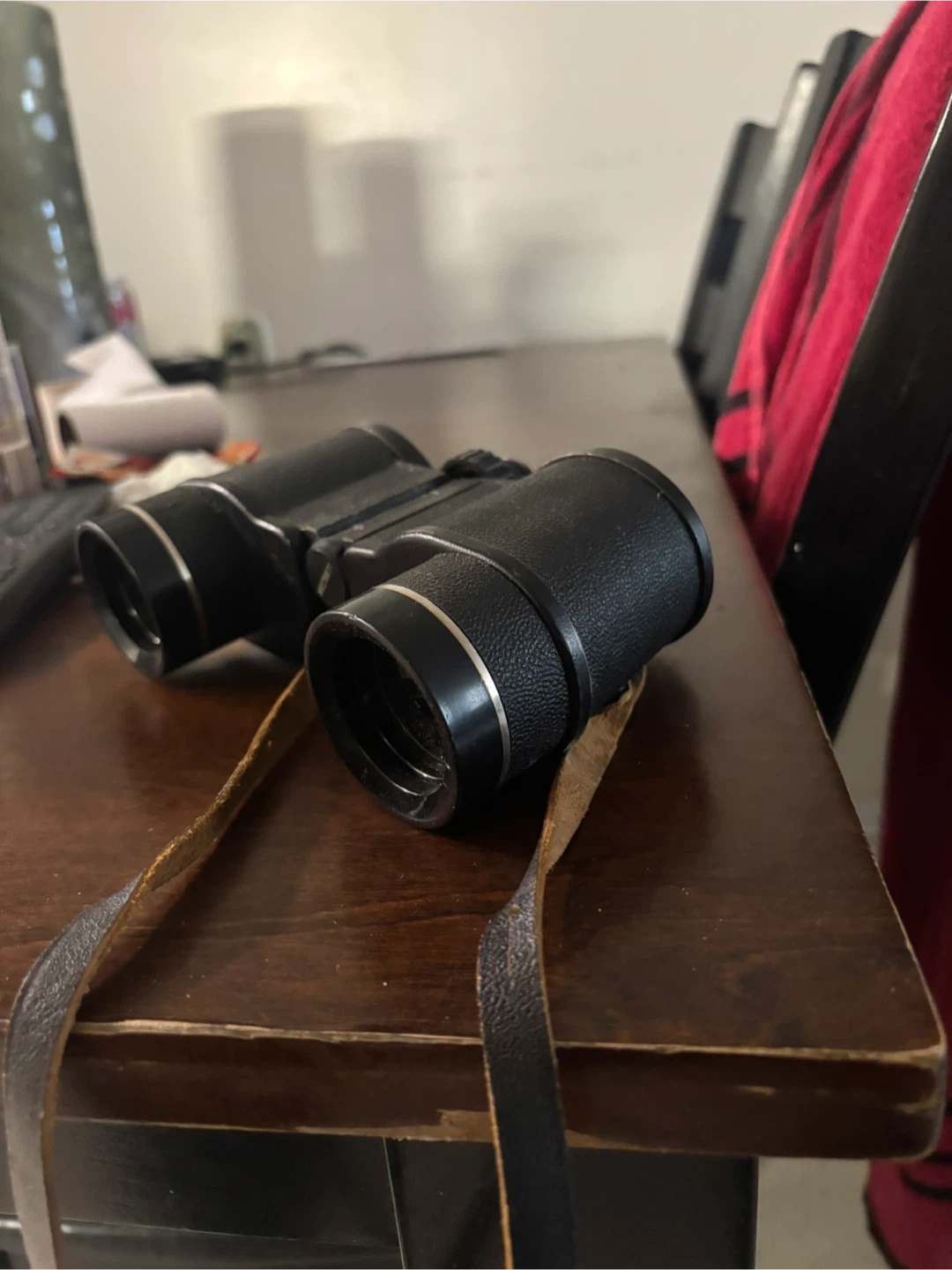 Selling a pair of vintage binoculars. They show some signs of wear on the strap, but the lenses are still clear. Great for birdwatching or outdoor adventures!