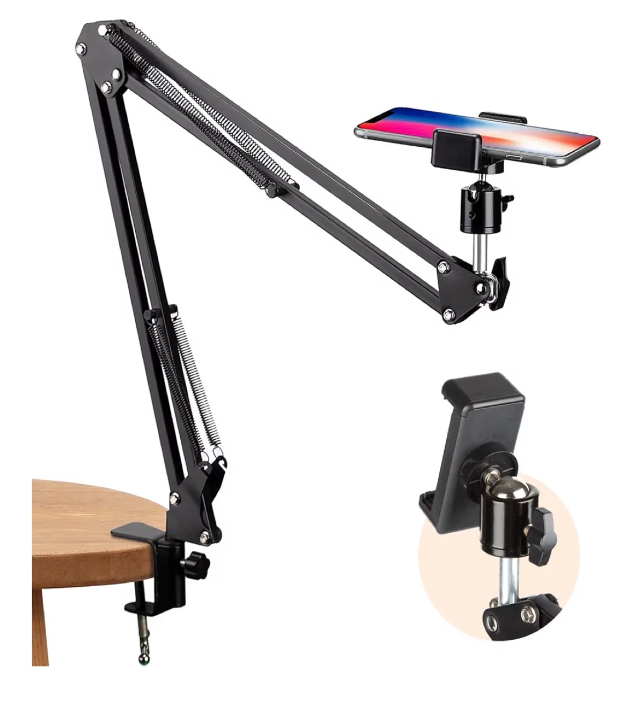 Selling an adjustable phone suspension boom scissor arm stand. It's suitable for many surfaces and tables or desktops with a thickness of up to 1.77inch / 45mm. Padded clamp, easy to attach