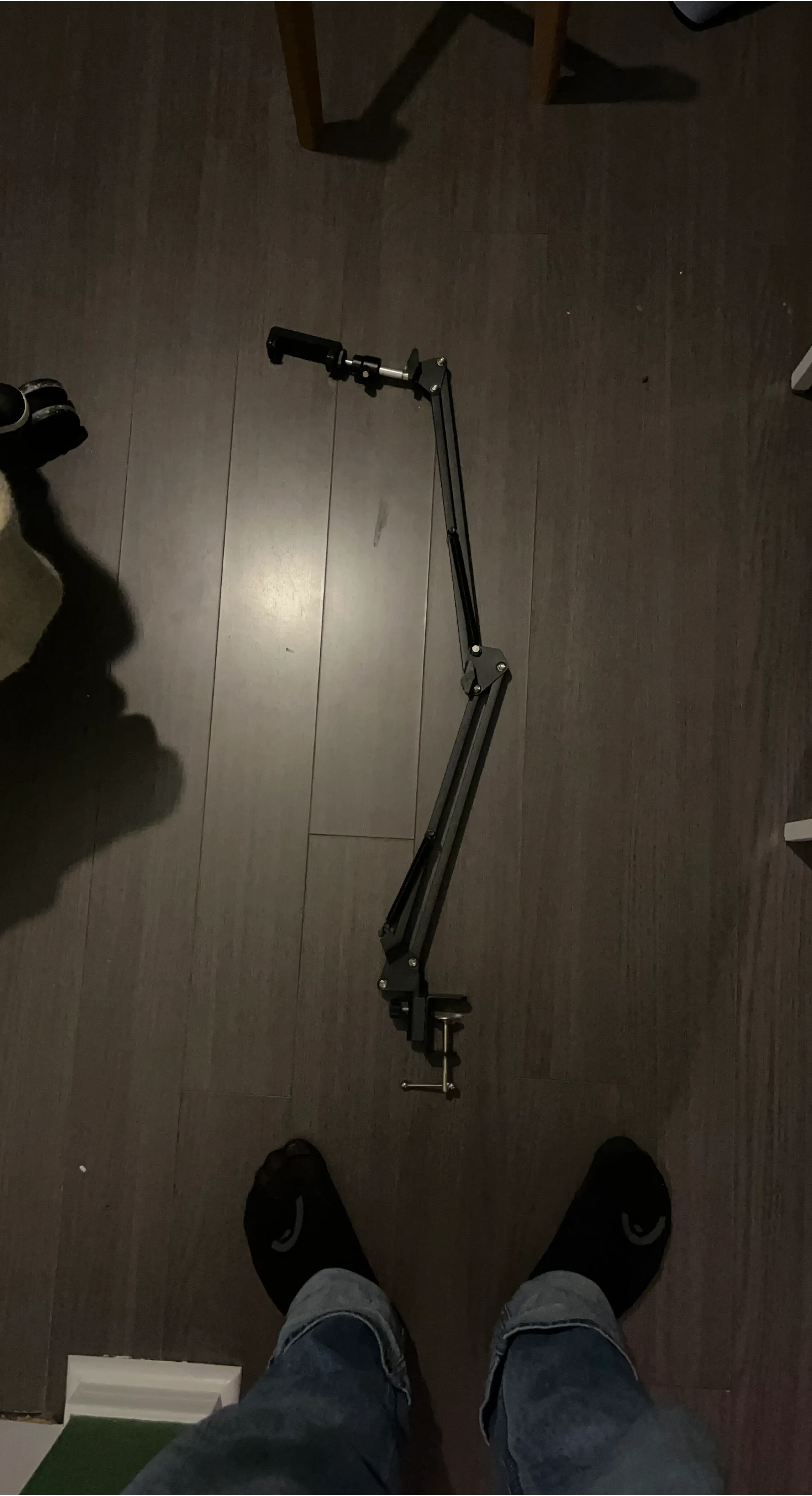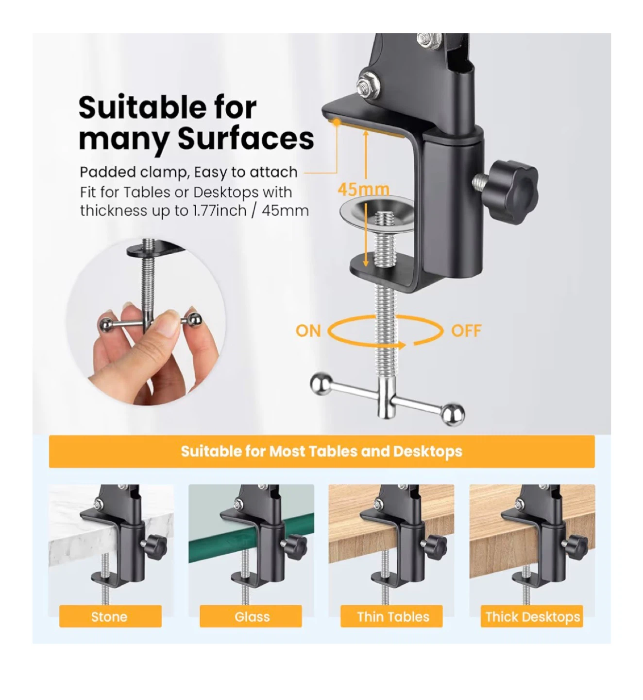 Selling an adjustable phone suspension boom scissor arm stand. It's suitable for many surfaces and tables or desktops with a thickness of up to 1.77inch / 45mm. Padded clamp, easy to attach