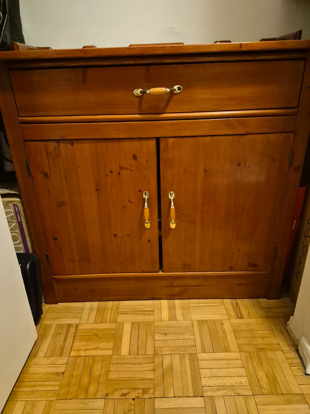 A lovely wooden cabinet with a drawer and two doors. It's perfect for adding some storage to your home. The cabinet is in good condition and ready to use!