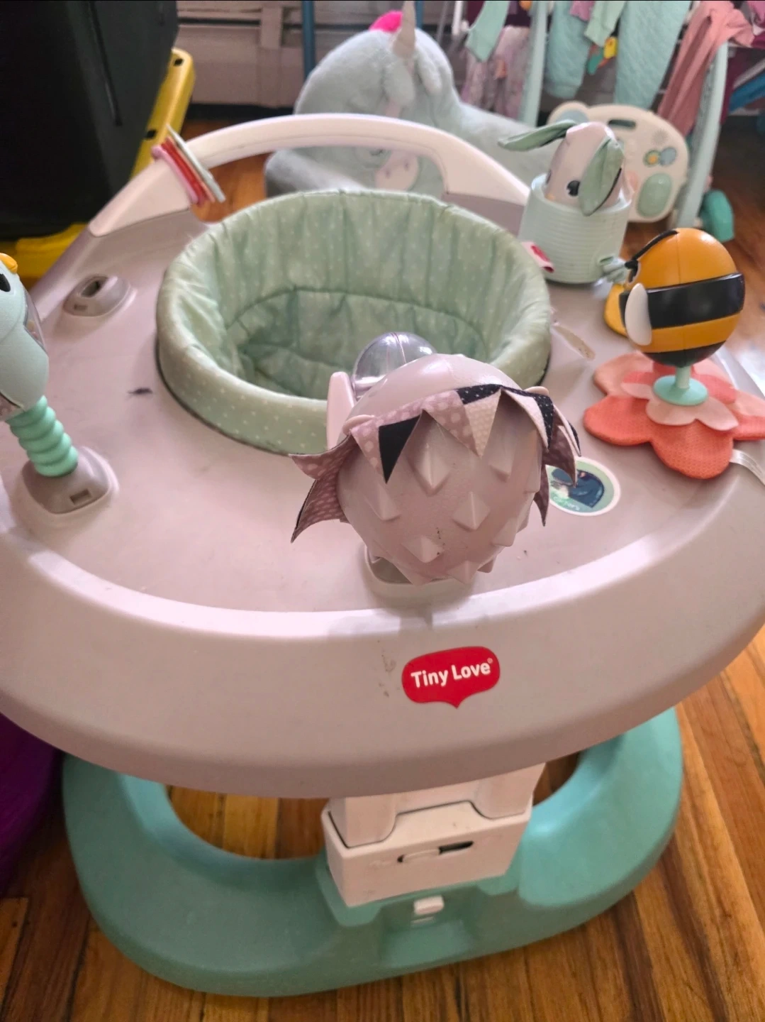 Selling a Tiny Love 4-in-1 Here I Grow Baby Mobile Activity Center! It's in great condition and ready for a new little one. The seat pad is removable for easy cleaning, which is super convenient. This activity center provides lots of fun and developmental activities for your baby!