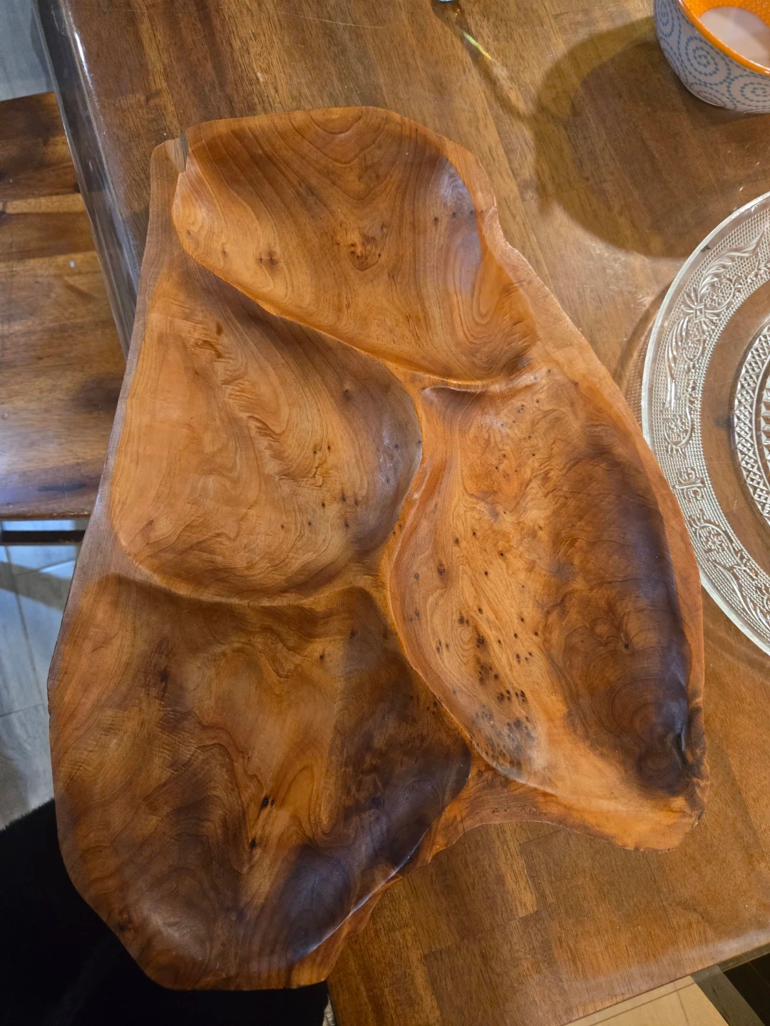 Selling a unique wooden serving tray! It's perfect for serving snacks or appetizers at your next gathering. The tray has a beautiful natural wood grain and a distinctive shape with divided sections.