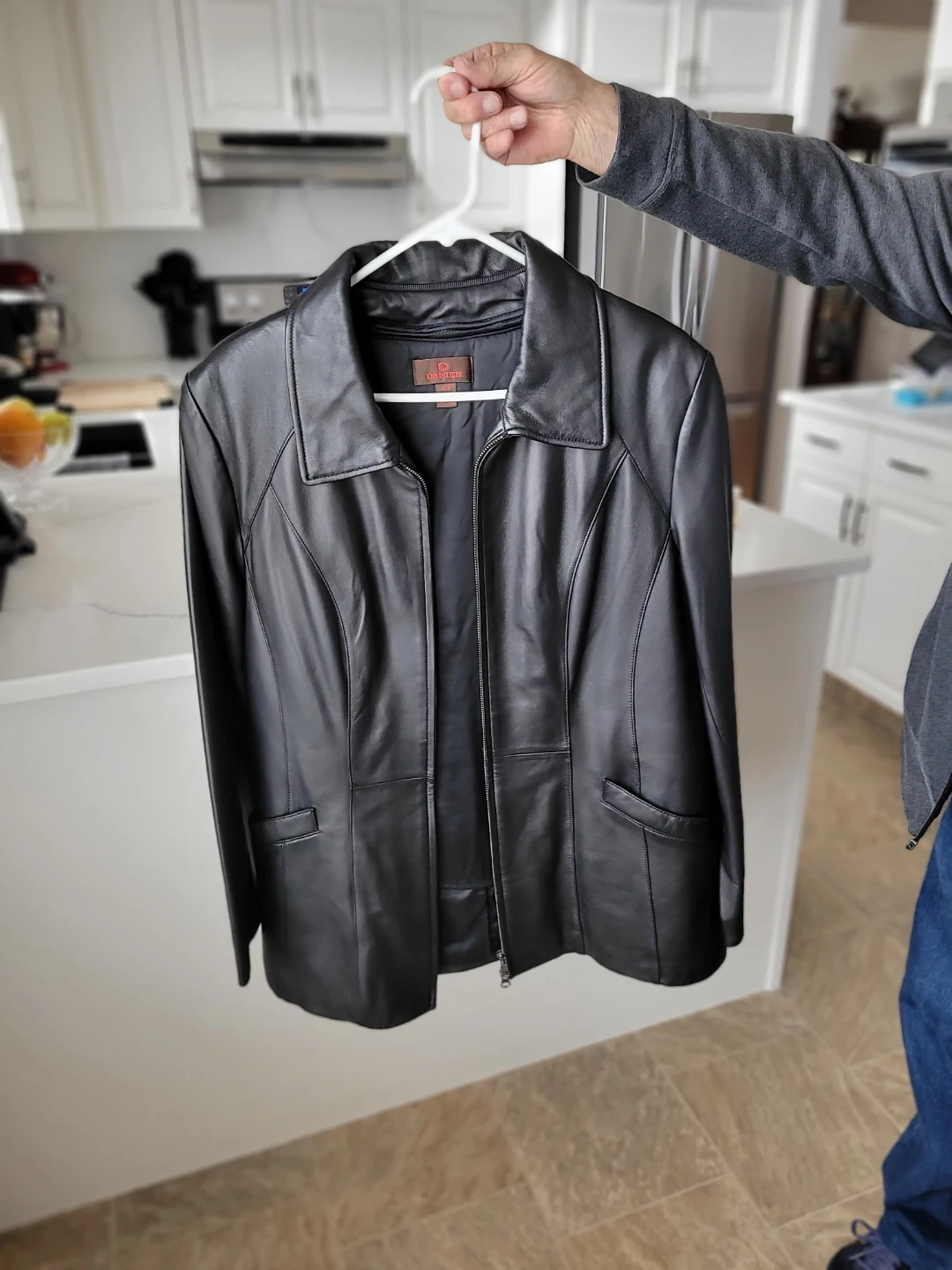 Here's a stylish black leather jacket from Danier! It's a size large and such soft leather. Like new. Great for our Calgary winters.