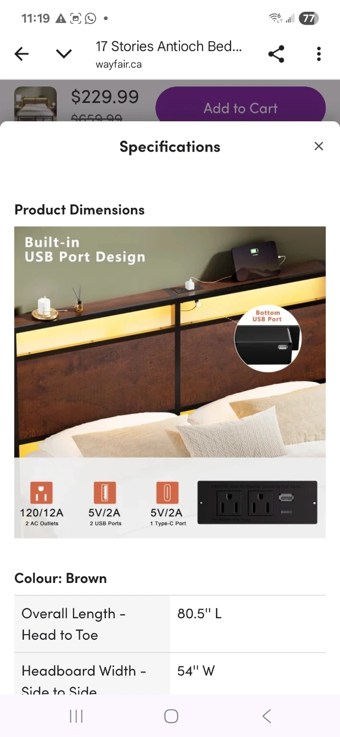 Selling a full-size bed frame from 17 Stories! This is the Antioch model in brown. It comes with LED lighting and a charging station built into the headboard. Plenty of storage underneath the bed.