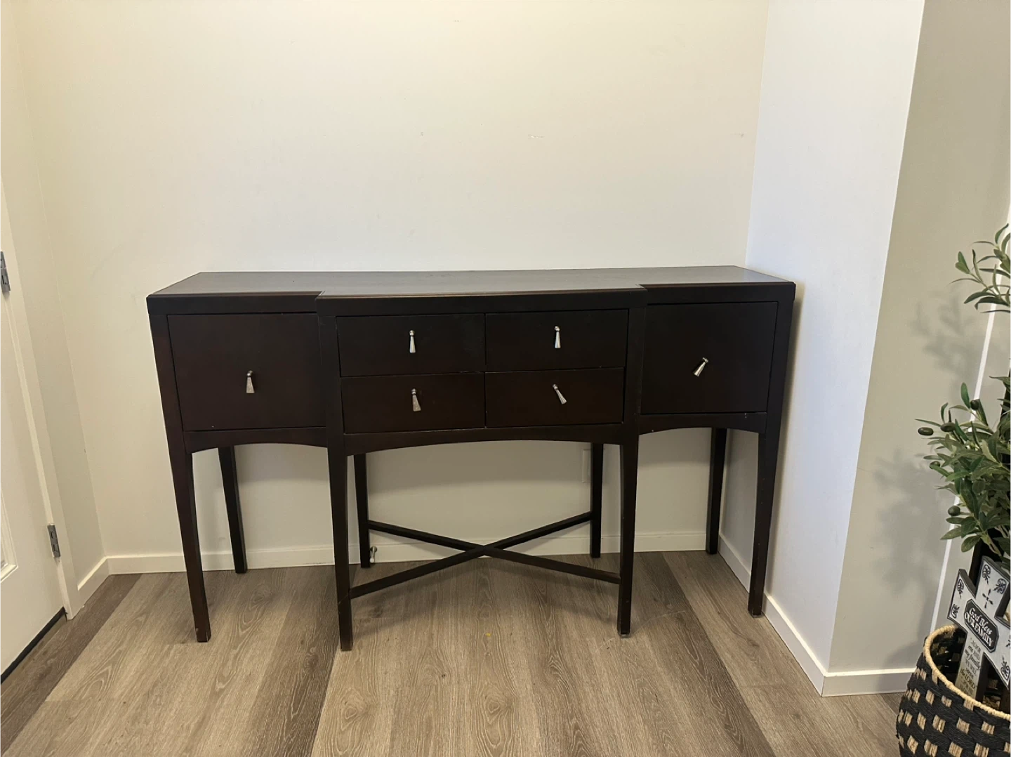 A stylish dark brown console table, perfect for adding a touch of elegance to your living space. It features multiple drawers and a sleek design. Great for entryways, living rooms, or dining areas