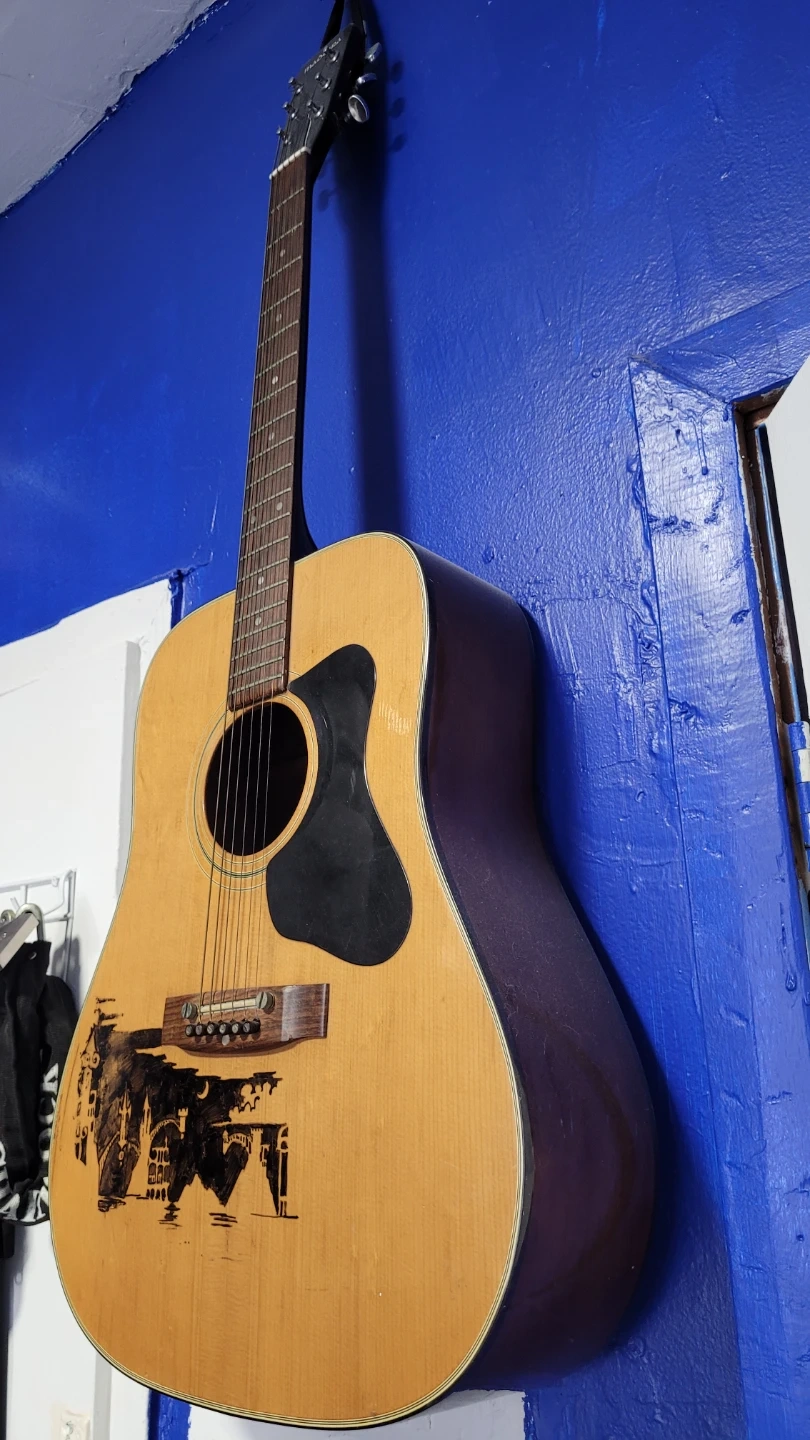Selling a Madeira acoustic guitar. It has a unique design on the front that has slightly faded. It's in good condition and ready for a new owner to enjoy playing it