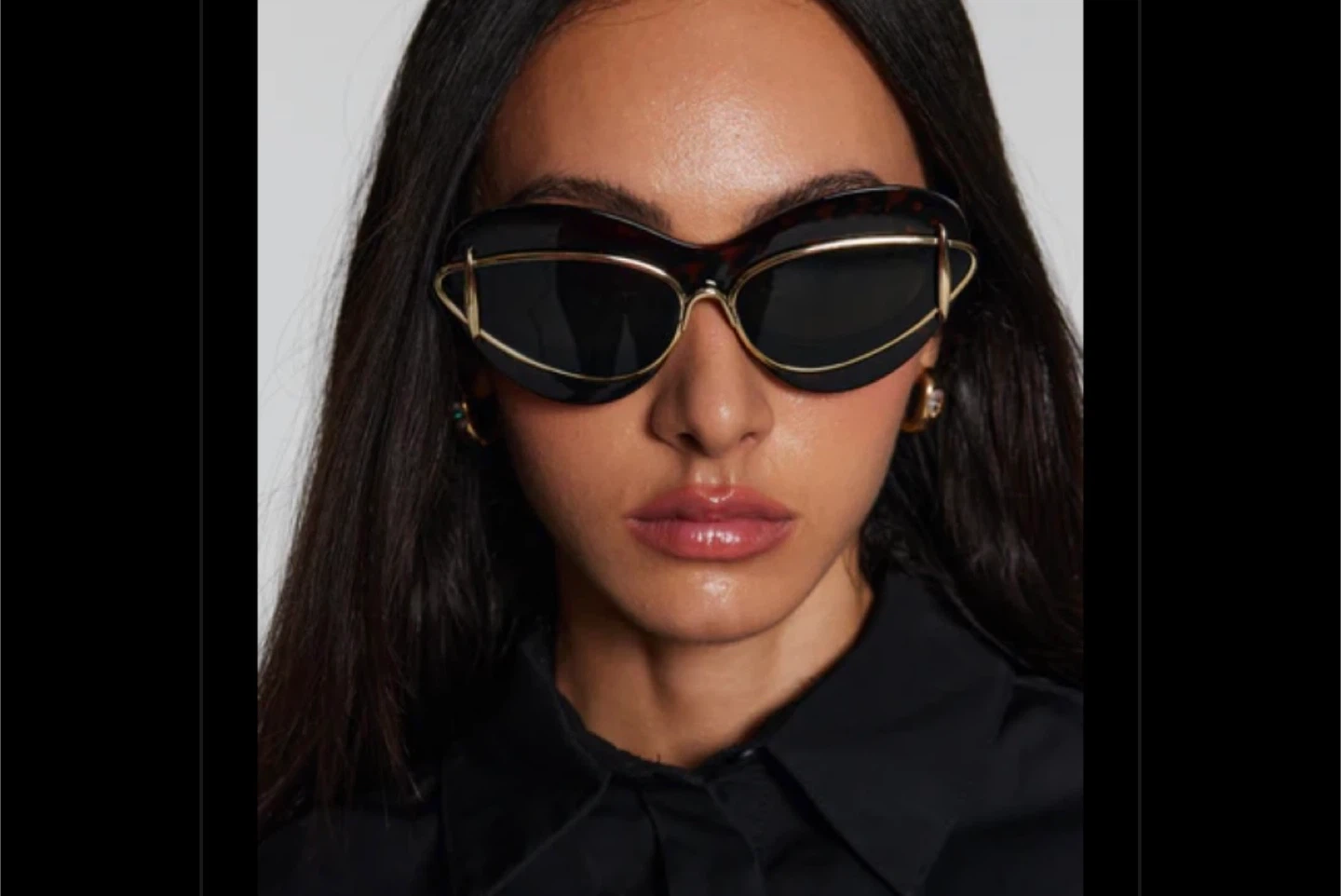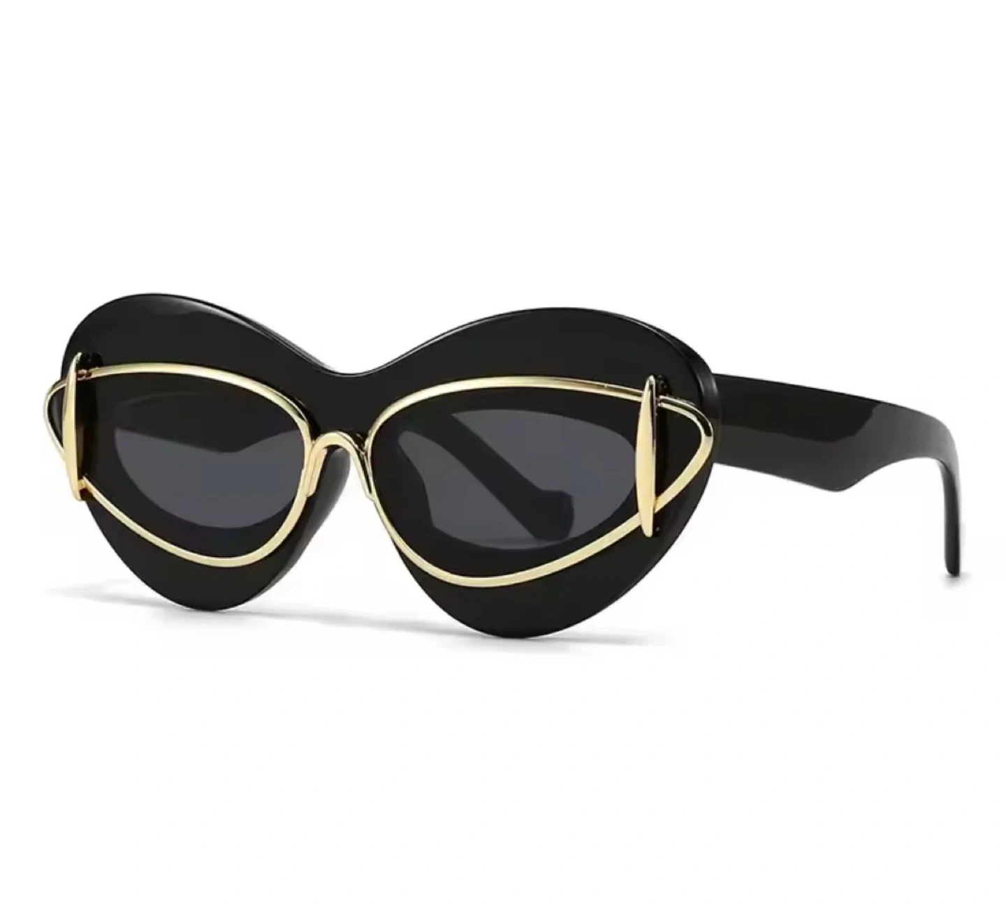Stylish sunglasses with a unique black frame and gold accent design! These are sure to make a statement and add a touch of elegance to any outfit