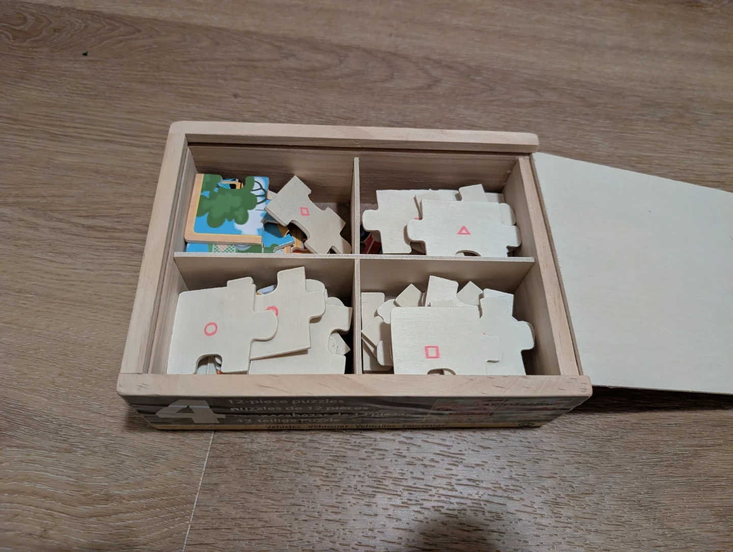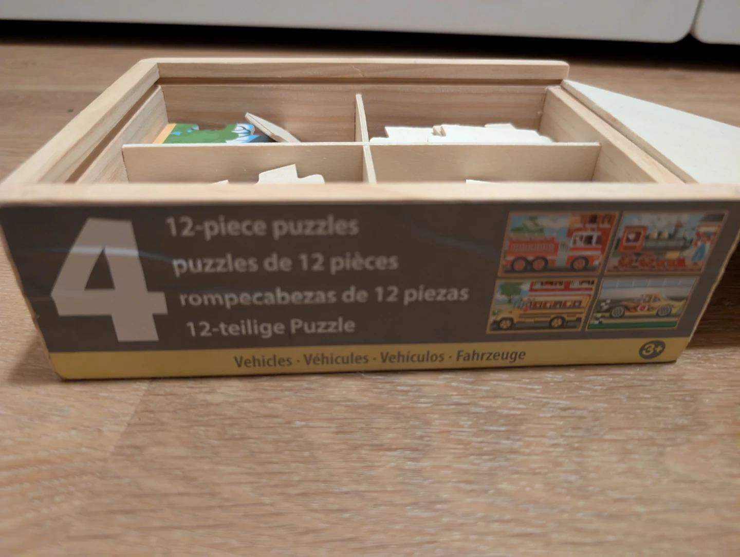 I'm selling a set of 4 twelve-piece puzzles featuring vehicles! They come in a wooden box with compartments to keep each puzzle separate. Perfect for kids aged 3+
