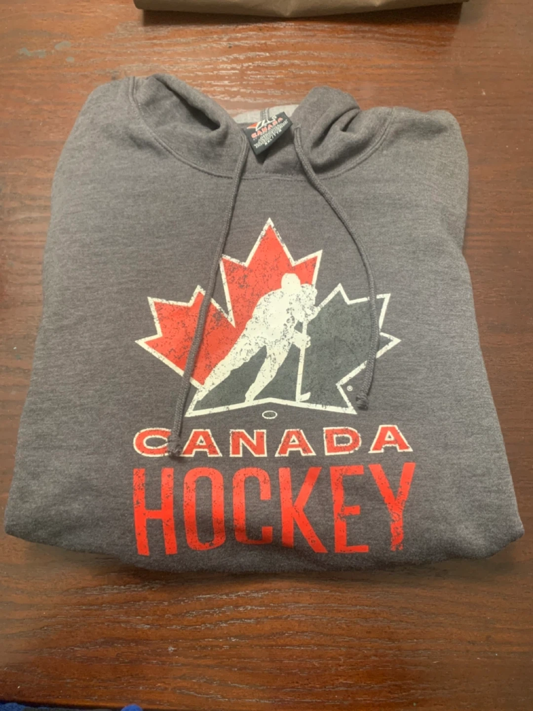Selling a Canada Hockey hoodie by 5th & Ocean Clothing. It's a size XXL and made of 51% cotton and 49% polyester. The hoodie is grey with a red and white Canada Hockey design on the front