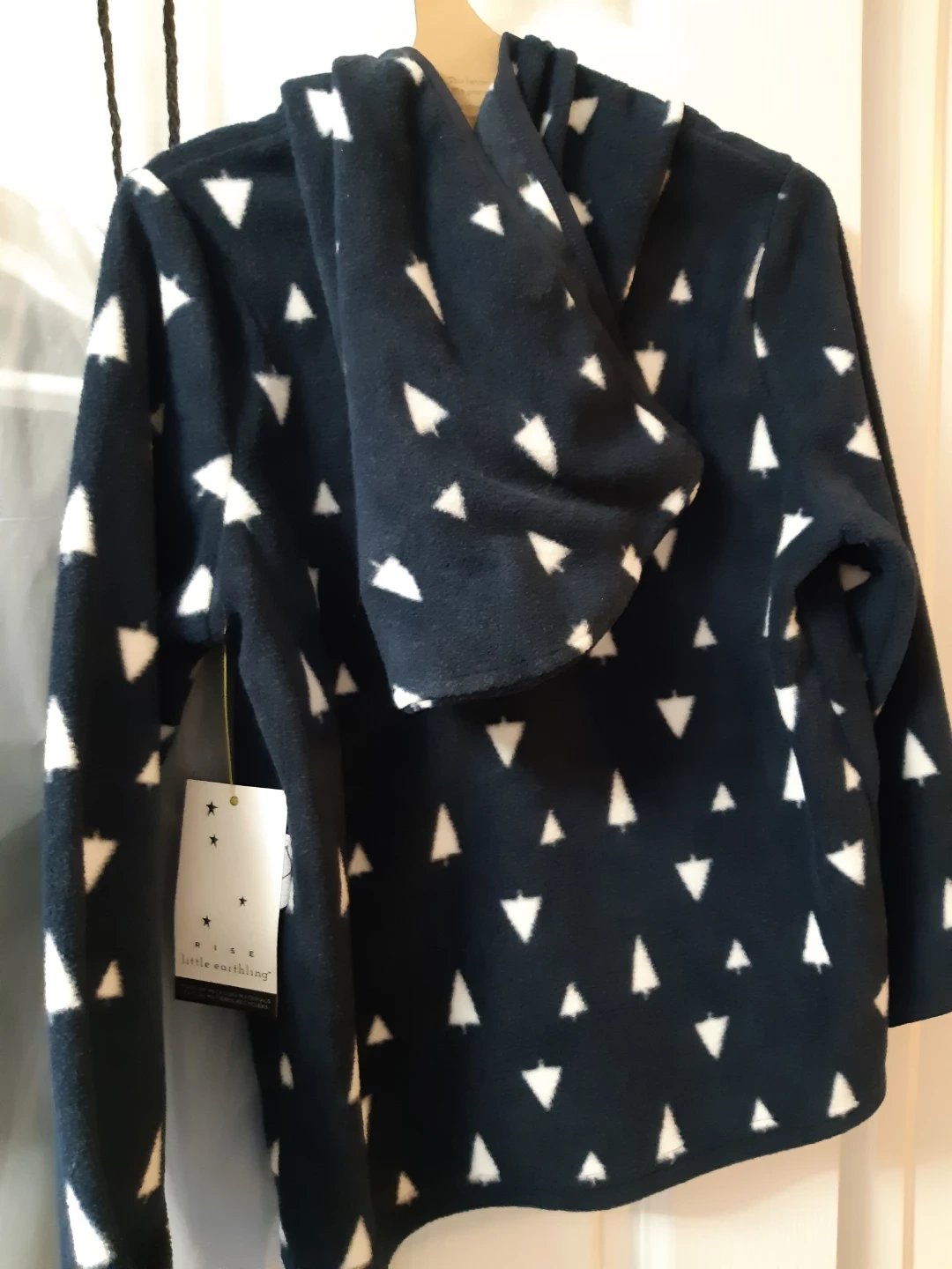 Cozy Little Earthling fleece hoodie in a cute navy blue colour with a white tree pattern! The size is 5-6 years. Perfect for keeping your little one warm and stylish during cooler weather