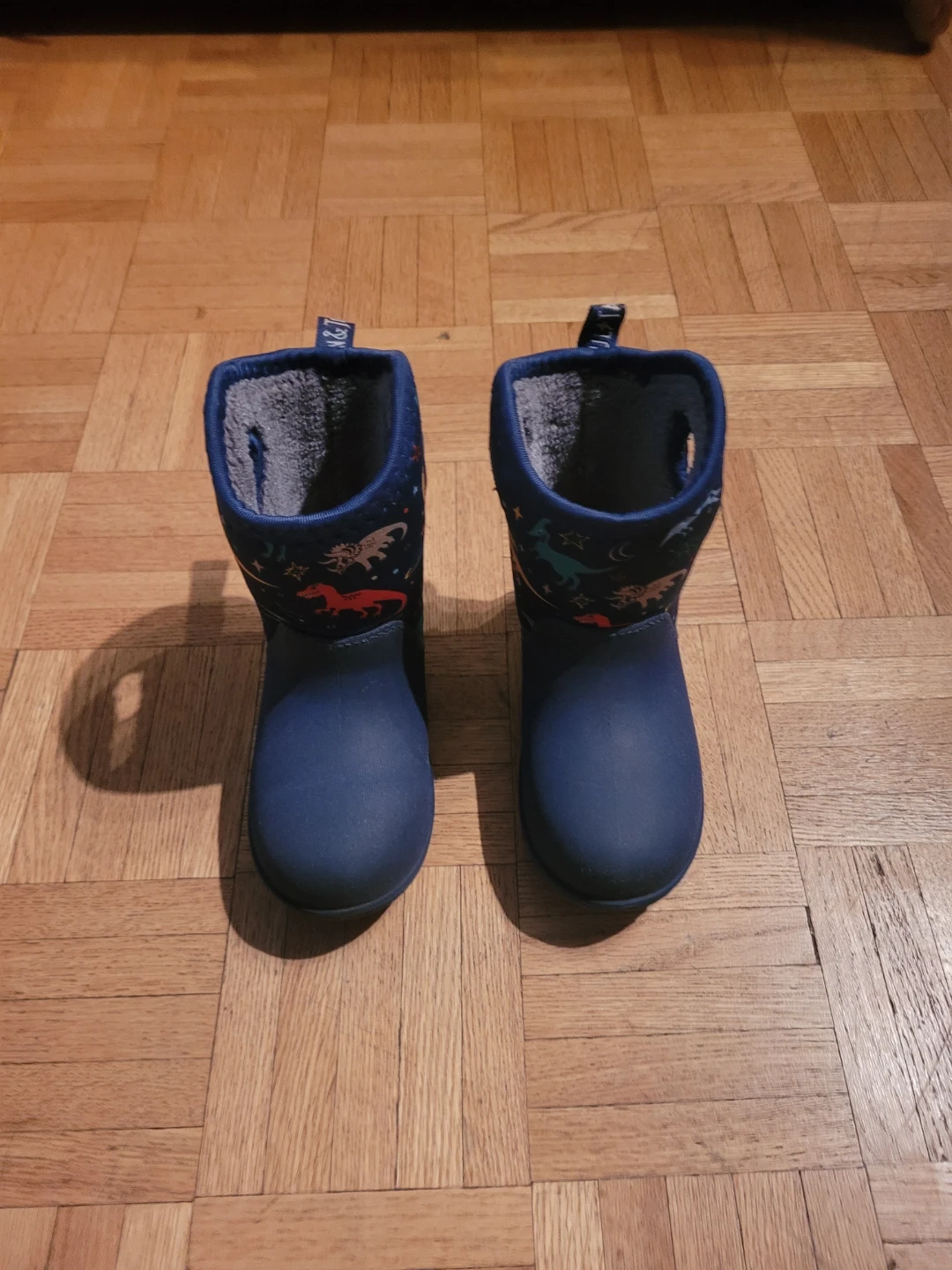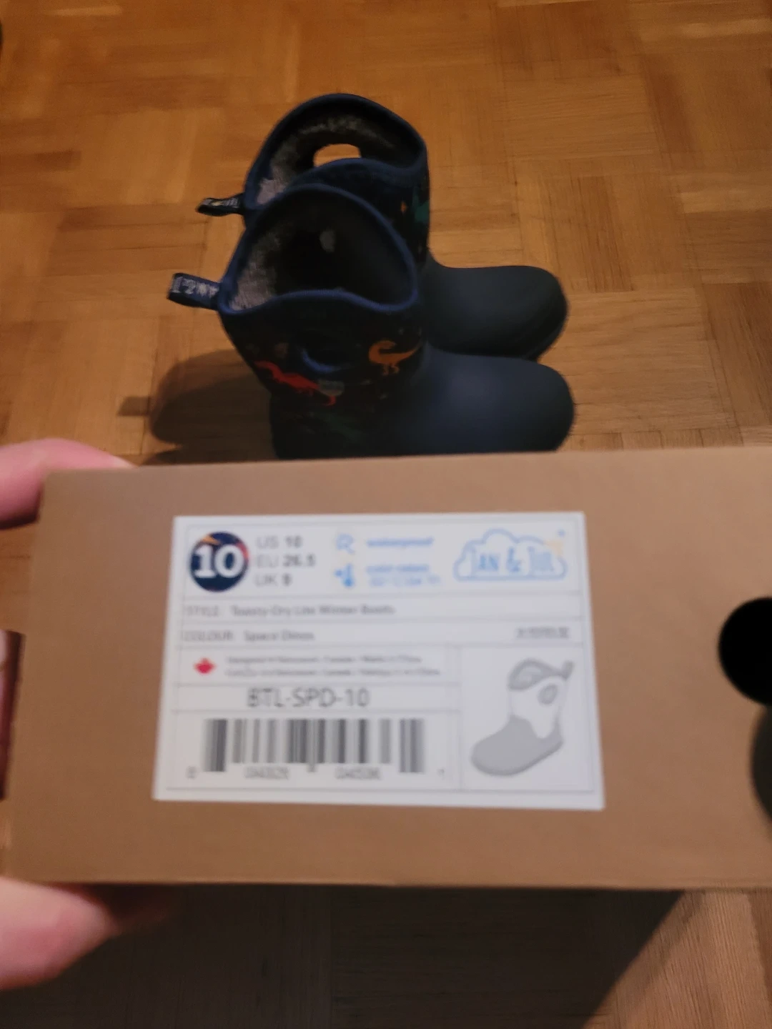 Selling a pair of waterproof winter boots in toddler size 10. They are in great condition and feature a fun dinosaur pattern and a warm sherpa lining.