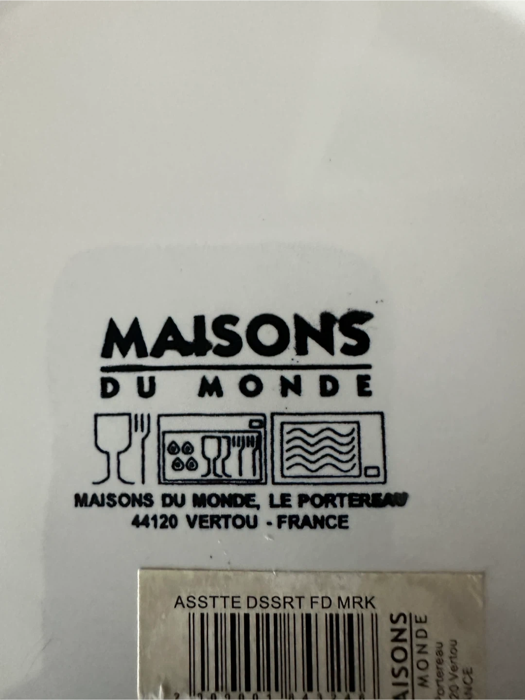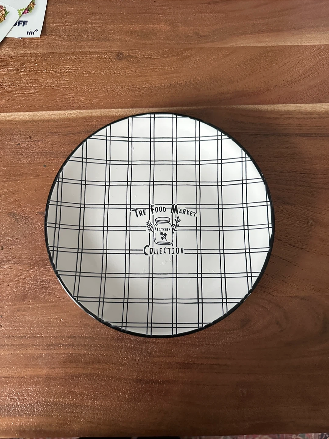 Selling a dessert plate from Maisons du Monde! It features a charming grid pattern with "The Food Market Collection" design in the center. Perfect for adding a touch of style to your table setting