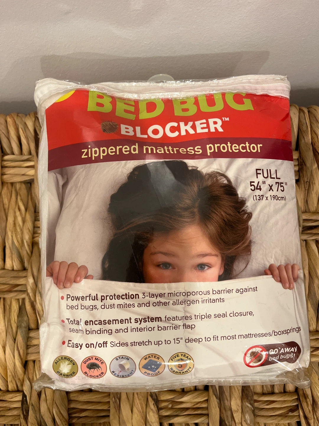 Selling a Bed Bug Blocker zippered mattress protector for a full-size bed (54" x 75"). It features a 3-layer microporous barrier for powerful protection against bed bugs, dust mites, and other allergens. The total encasement system has a triple seal closure, seam binding, and interior barrier flap. Easy on/off design stretches up to 15" deep to fit most mattresses/box springs