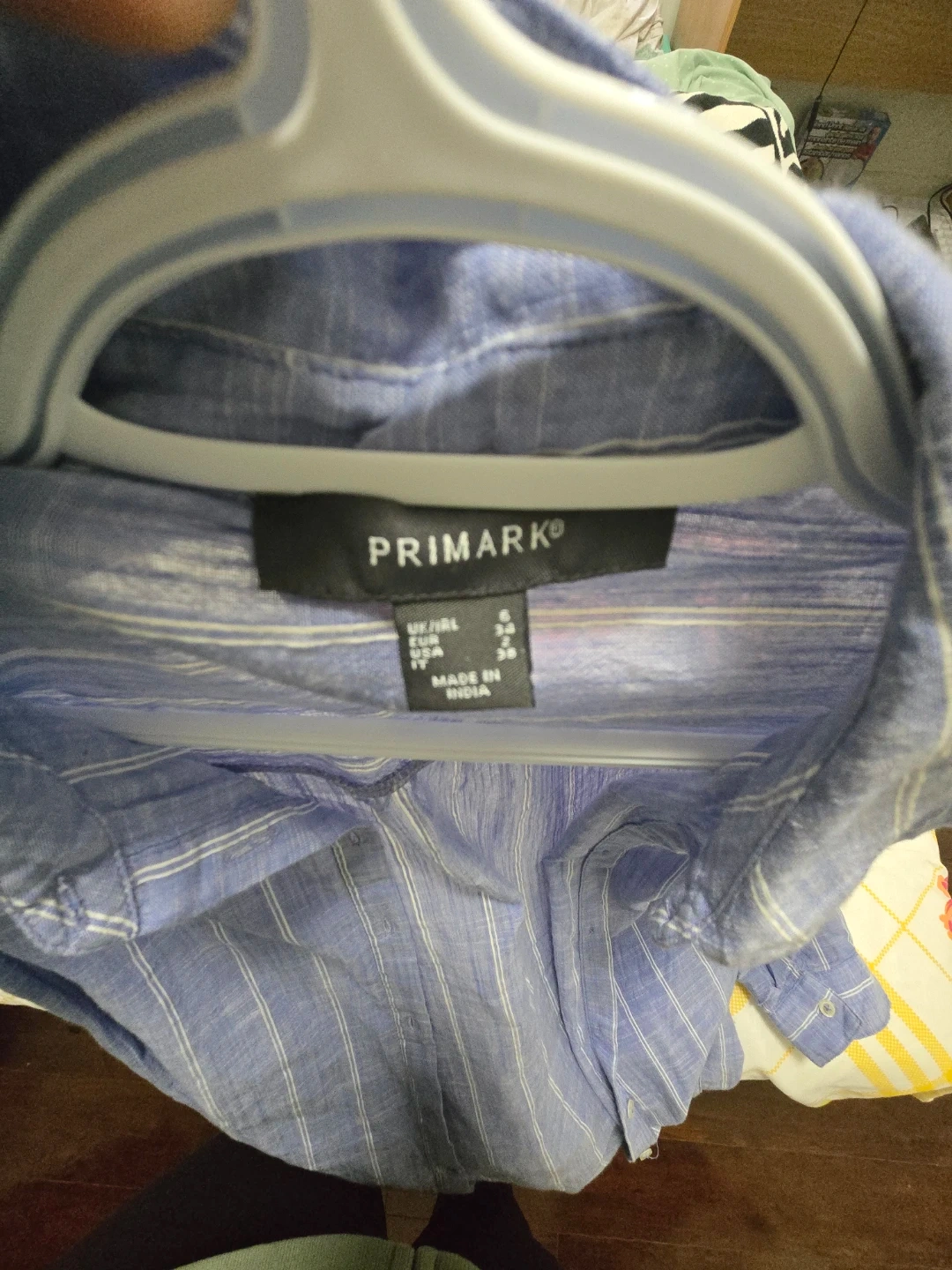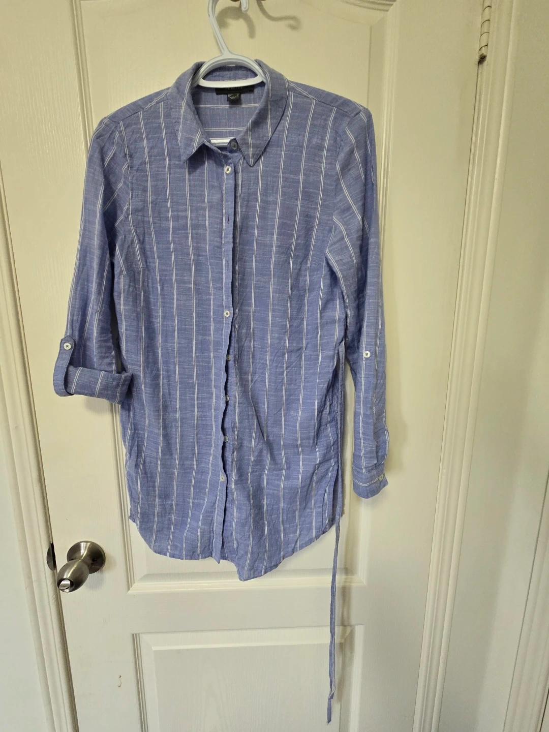 A cute and casual blue button-down shirt with white stripes! It's a size small and in great condition. 100% cotton.