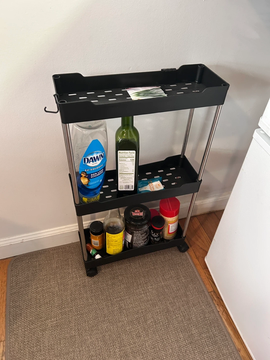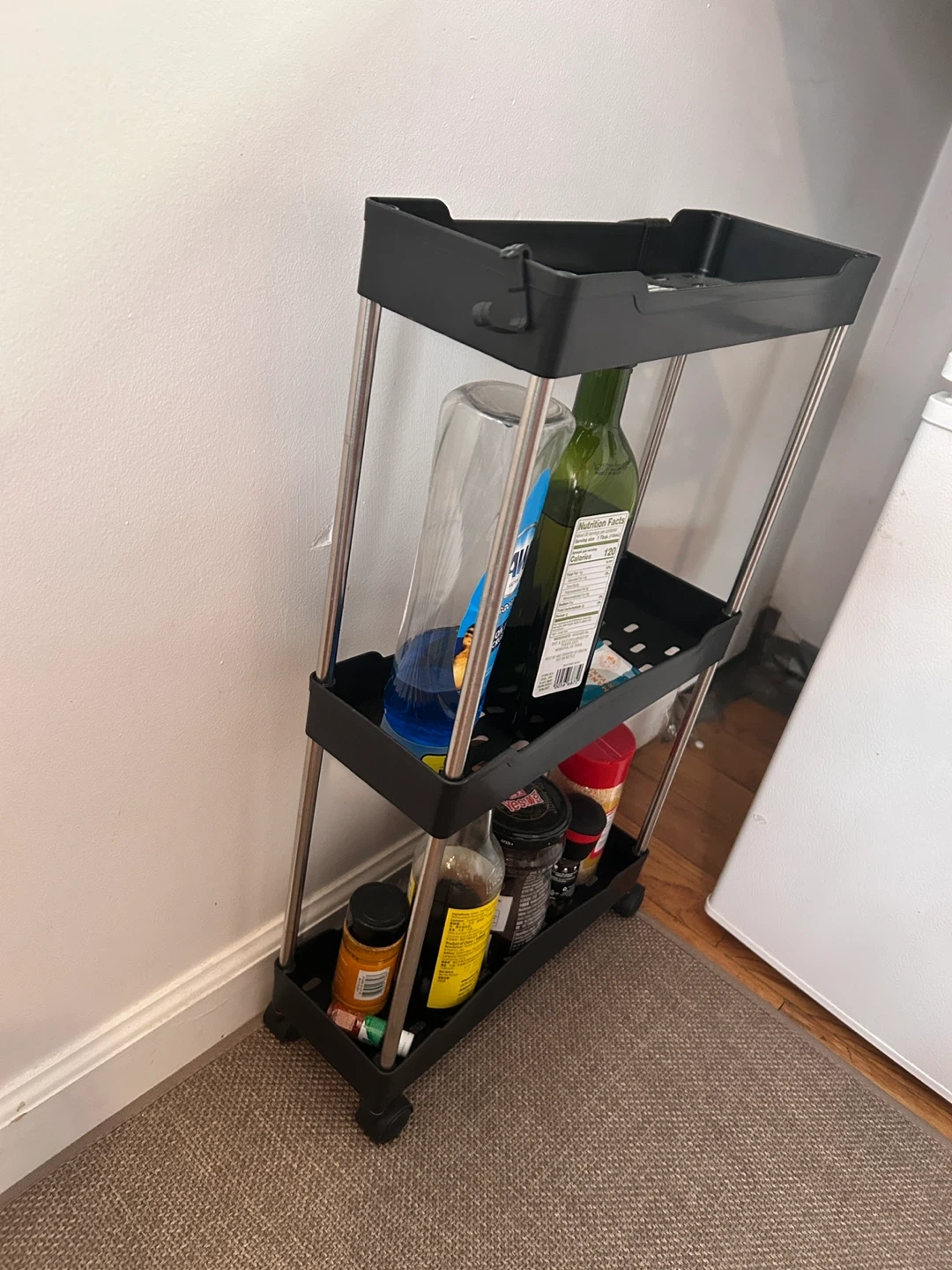 This is a handy 3-tier rolling utility cart in black! It's perfect for organizing items in the kitchen, bathroom, or any small space. It's easy to move around with its smooth-rolling wheels