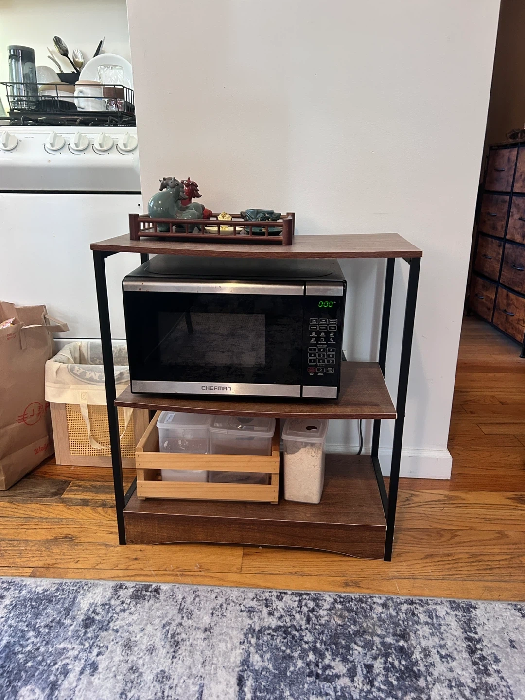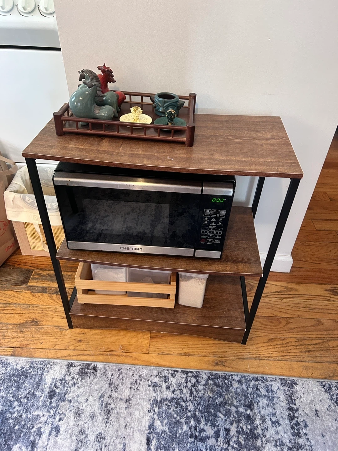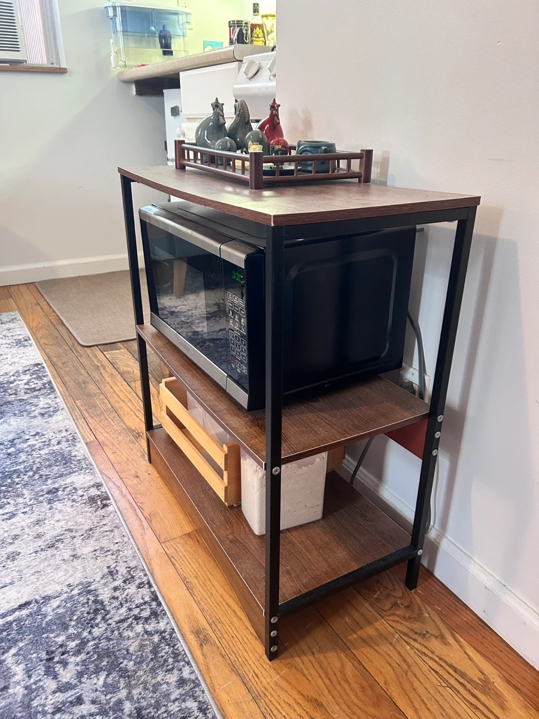 Here's a sturdy wooden 3-tier stand with shelves! It's perfect for adding extra storage to your kitchen or dining area. The stand has a wood grain finish with a black metal frame.