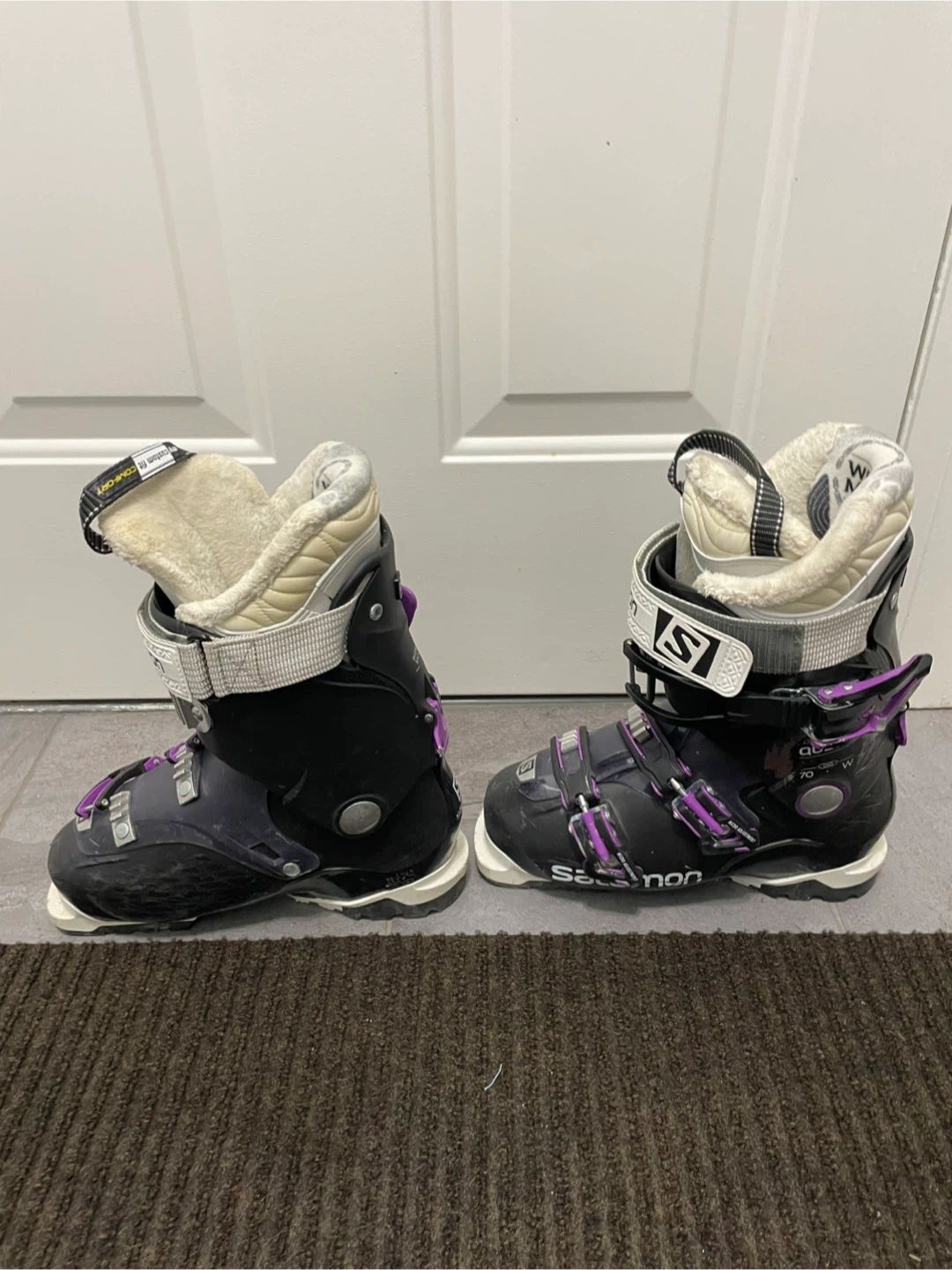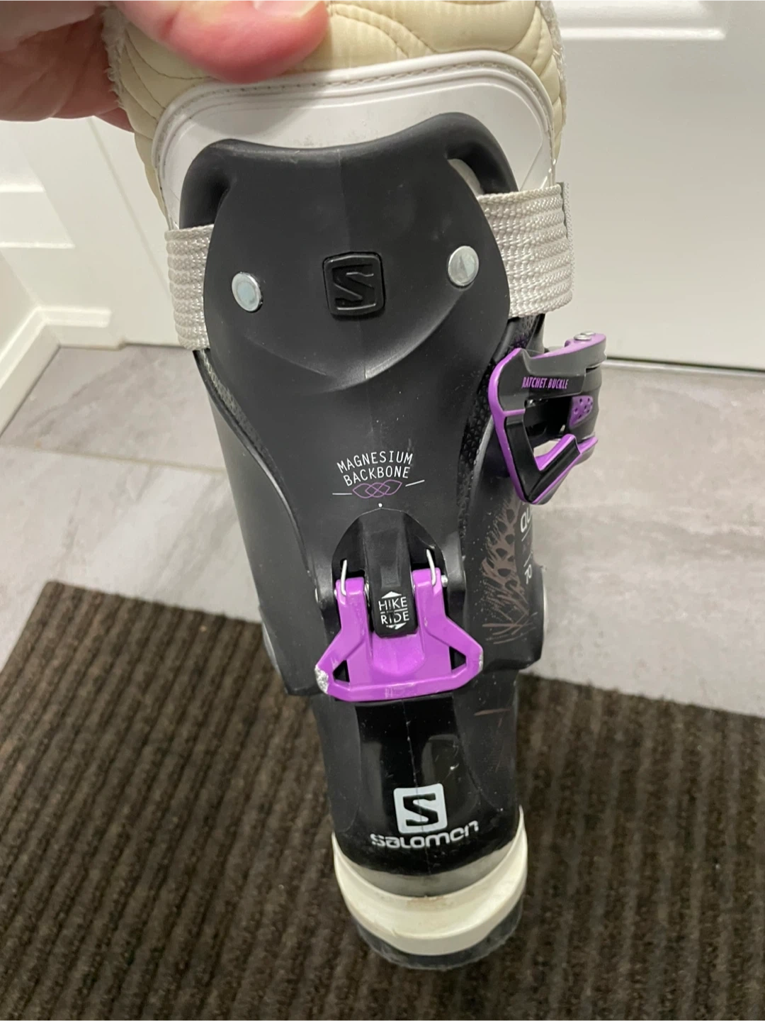 Selling a pair of Salomon Quest 70 W ski boots in size 24/24.5. These boots have a magnesium backbone and hike ride feature. They are black and purple in colour and in good condition for hitting the slopes!
