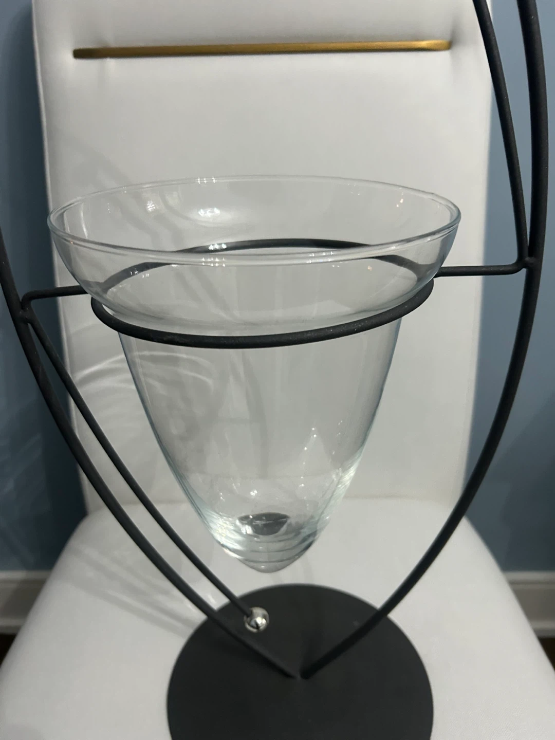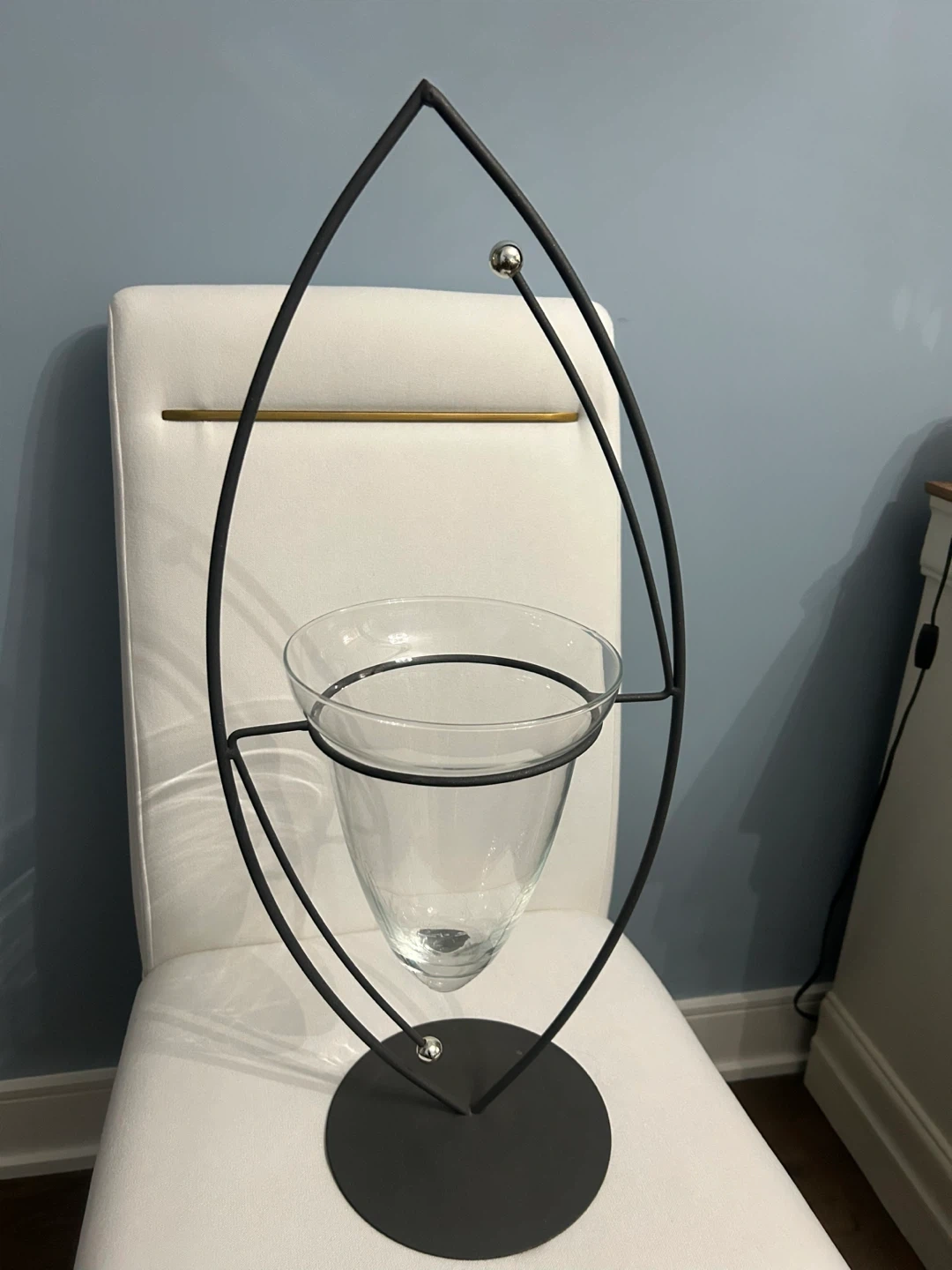 A stylish metal and glass vase. Modern design and is in excellent condition. It’s perfect for displaying flowers or as a standalone decorative piece!