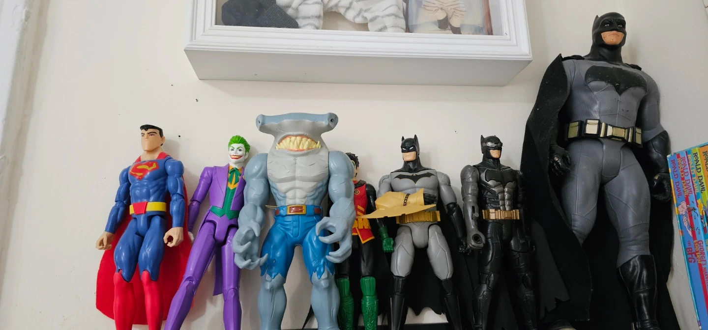Selling a collection of DC Comics action figures! Includes Superman, Batman (various versions), Joker, King Shark, and Robin. Great for collectors or kids who love superheroes and villains