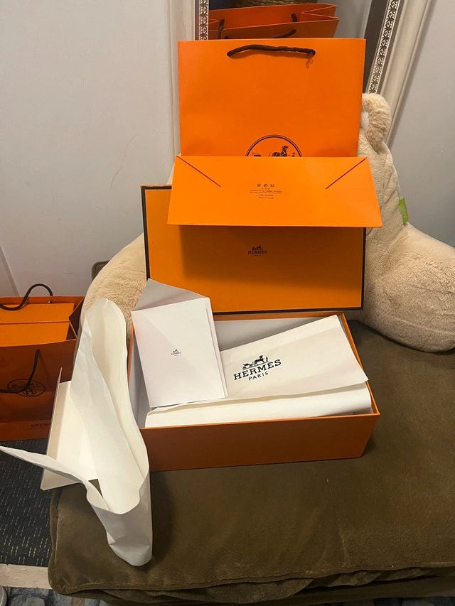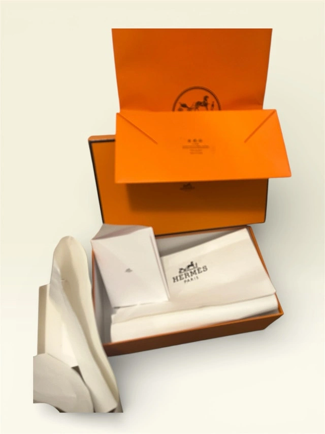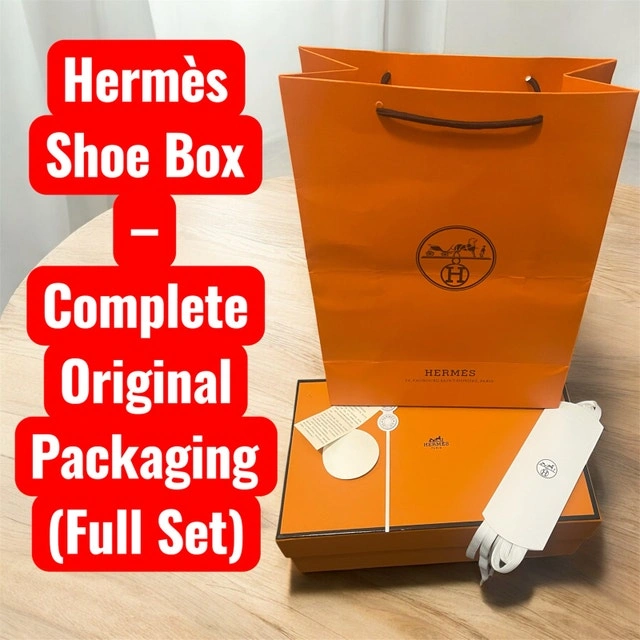 This Hermès shoe box includes the complete original packaging and is in excellent condition. Perfect for collectors or those looking to add a touch of luxury to your storage solutions. Comes with the box, paper, and ribbon. If the ad is up, it's available!