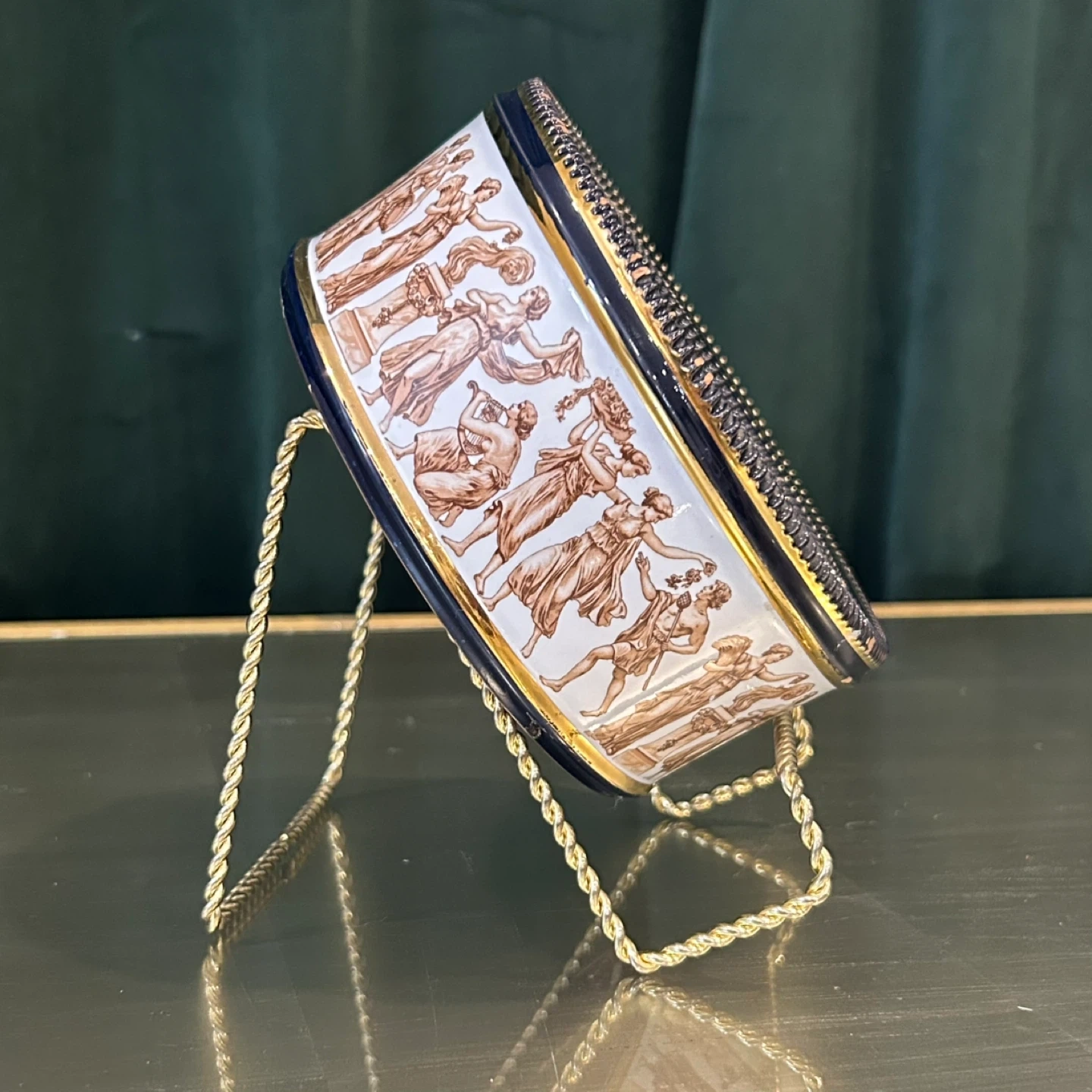 This piece features a continuous grisaille classical frieze depicting draped female figures in procession—musicians, dancers, and votive bearers—directly inspired by ancient Roman reliefs and Renaissance interpretations of antiquity. The imagery closely follows motifs popularized by Wedgwood jasperware and Grand Tour decorative arts, long favored by European aristocratic collectors.