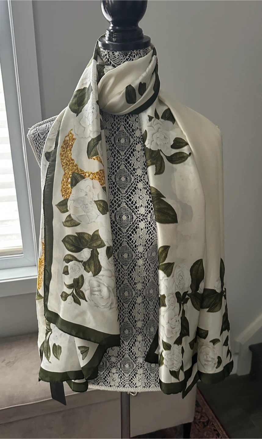 Beautiful floral print scarf. The scarf features a lovely design with white flowers and green leaves, accented by a gold chain pattern. Perfect for adding a touch of elegance to any outfit